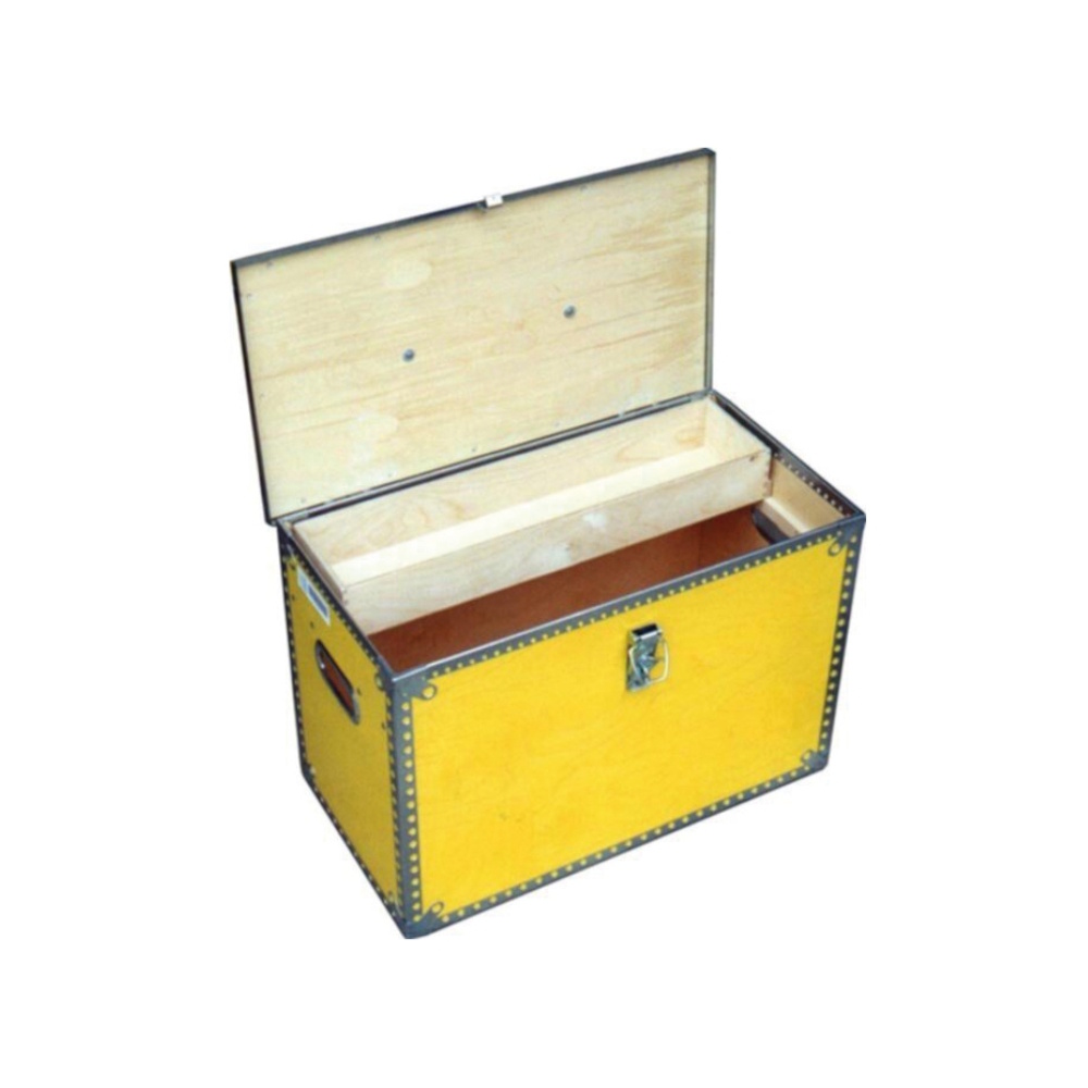 Værktøjskasse med løs skydeindsats. Lavet af gulbejdset og UV-lakeret vandtæt birkekrydsfiner. Monteret med galvaniserede stålbeslag på alle kanter og hjørner. Forstærket låg med galvaniseret vinkeljernsramme, hvorpå hængsler og låse er monteret. Excentrisk lås er monteret med sikkerhedshasp. Kan også aflåses med hængelås.
