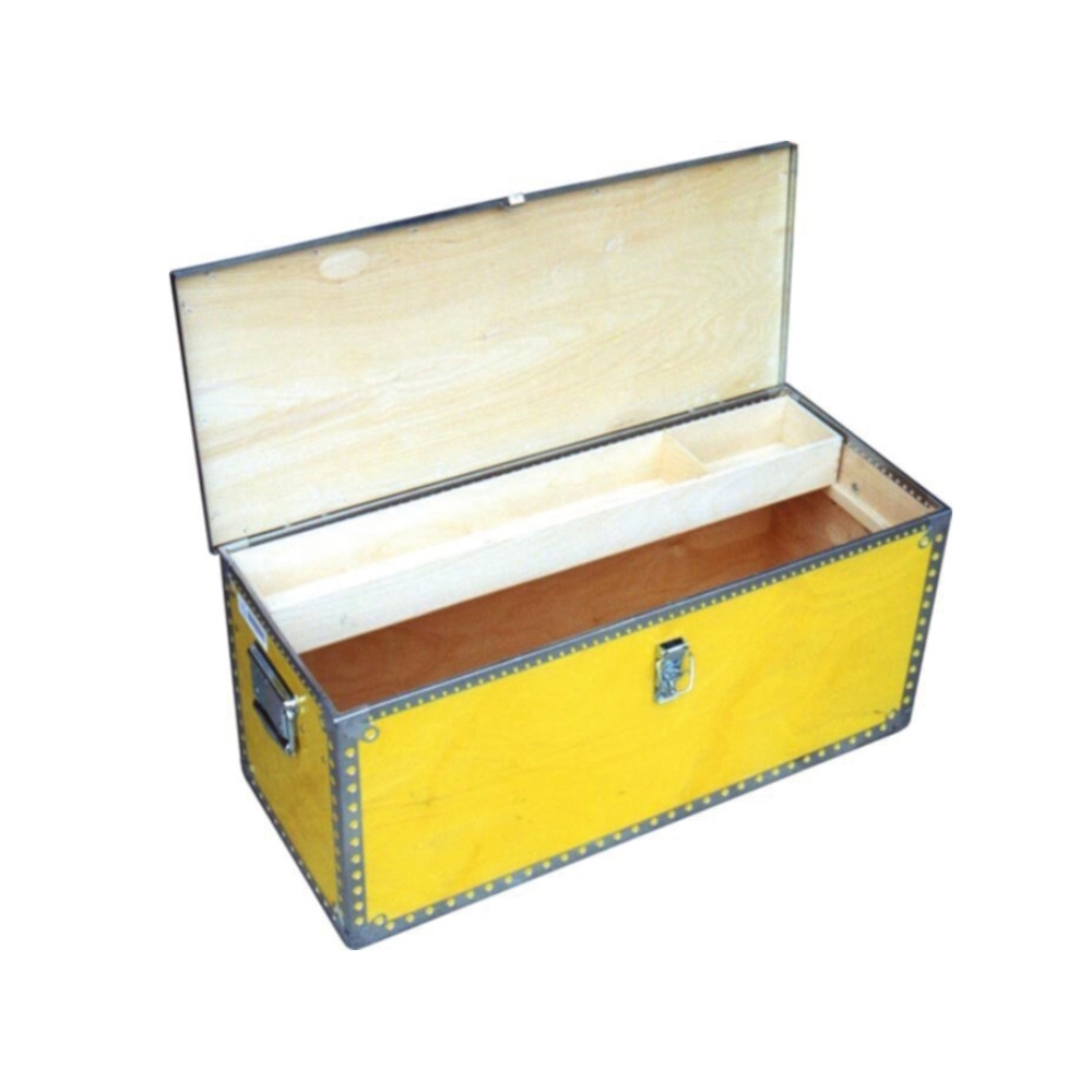 Værktøjskasse med løs skydeindsats. Lavet af gulbejdset og UV-lakeret vandtæt birkekrydsfiner. Monteret med galvaniserede stålbeslag på alle kanter og hjørner. Forstærket låg med galvaniseret vinkeljernsramme, hvorpå hængsler og låse er monteret. Excentrisk lås er monteret med sikkerhedshasp. Kan også aflåses med hængelås.