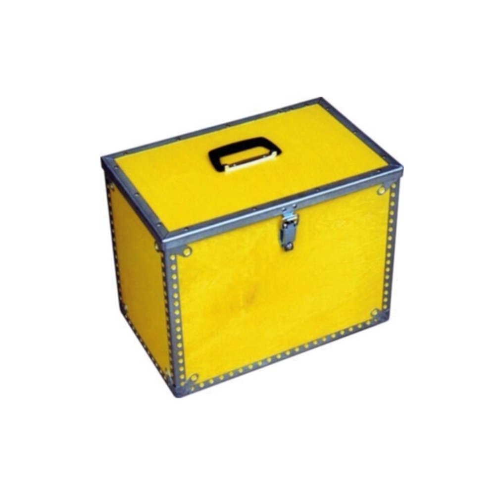Værktøjskasse uden indsats. Håndtag på låg. Fremstillet af gulbejdset og UV-lakeret vandtæt birkekrydsfiner. Monteret med galvaniserede stålbeslag på alle kanter og hjørner. Forstærket låg med galvaniseret vinkeljernsramme, hvorpå hængsler og låse er monteret. Excentrisk lås er monteret med sikkerhedshasp. Kan også låses med hængelås.