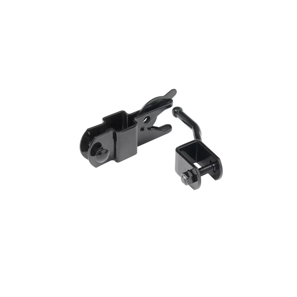 Låse til dobbeltport i sortmalet metal. Alt vores tilbehør til metalhegn og porte er galvaniseret, zinkgrundet og færdigbehandlet med sort pulverlakering.