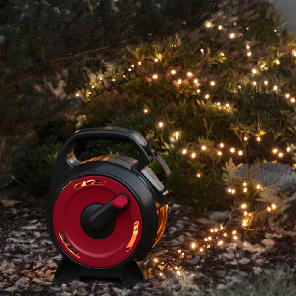 Smart ledningsopruller gør både montering og opbevaring nem. Lyskæden med varm hvid LED er allerede på plads - du skal bare dreje den ud, når det er tid til at dekorere, og dreje den tilbage, når du er færdig. Ingen sammenfiltringer, nem opbevaring og altid klar til næste sæson. Energibesparende LED og holdbar til udendørs brug.