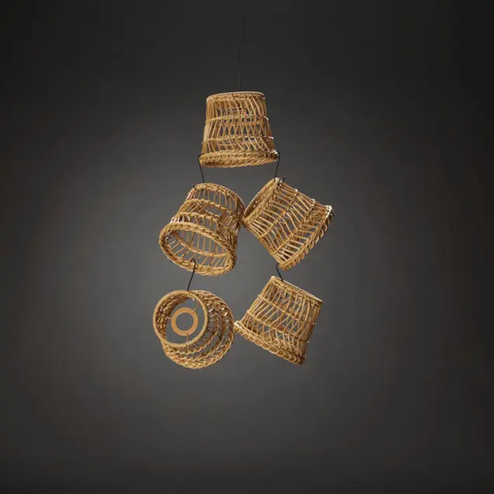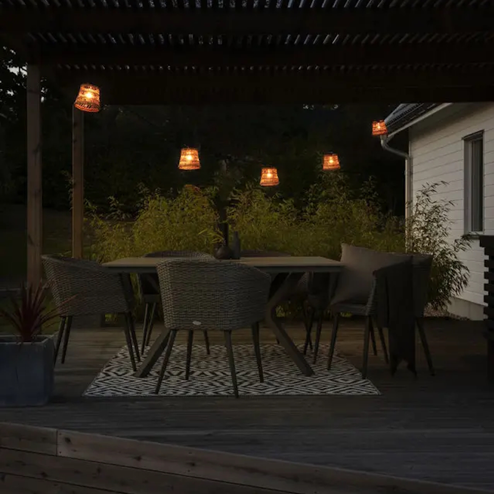 Rund fra Konstsmide er en pakke med 5 dekorative lampeskærme i kunstrotting. Perfekt til at sætte festlys på eller hænge alene med en passende ledningsholder til udendørs brug.