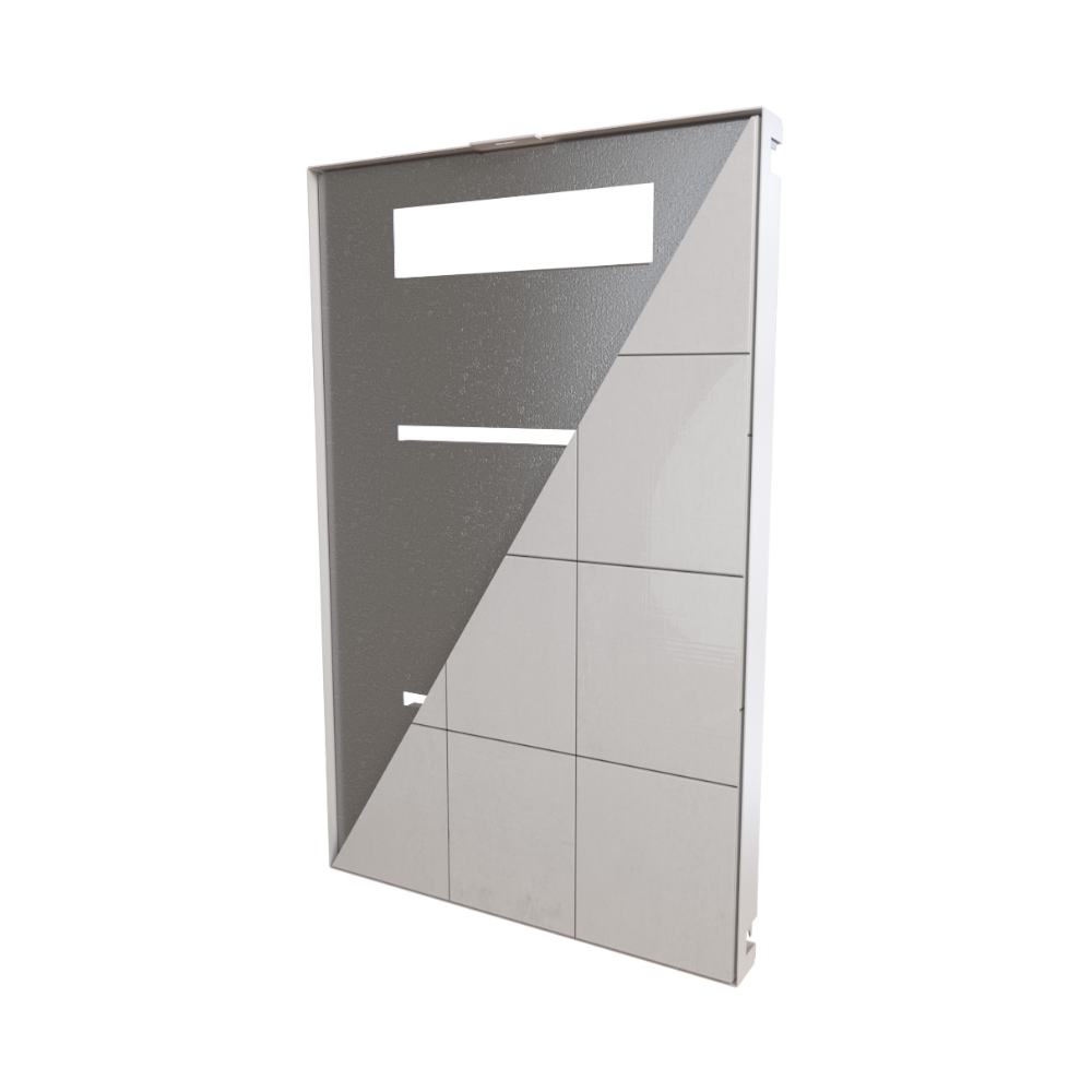 Dør beregnet til LK Vådzone Dør Forsegl. For at få et stilfuldt design er det muligt at lime fliser på døren. Den indvendige fliseramme kan justeres mellem 6-13mm, så overfladen på den færdige flisebelagte dør flugter med væggen. Døren lukkes med en magnet mod den tætte dør og har et diskret håndtag på overkanten til åbning. Døren er ikke beregnet til daglig vanding. Fremstillet af pulverlakeret galvaniseret stålplade, hvid farve RAL9016.