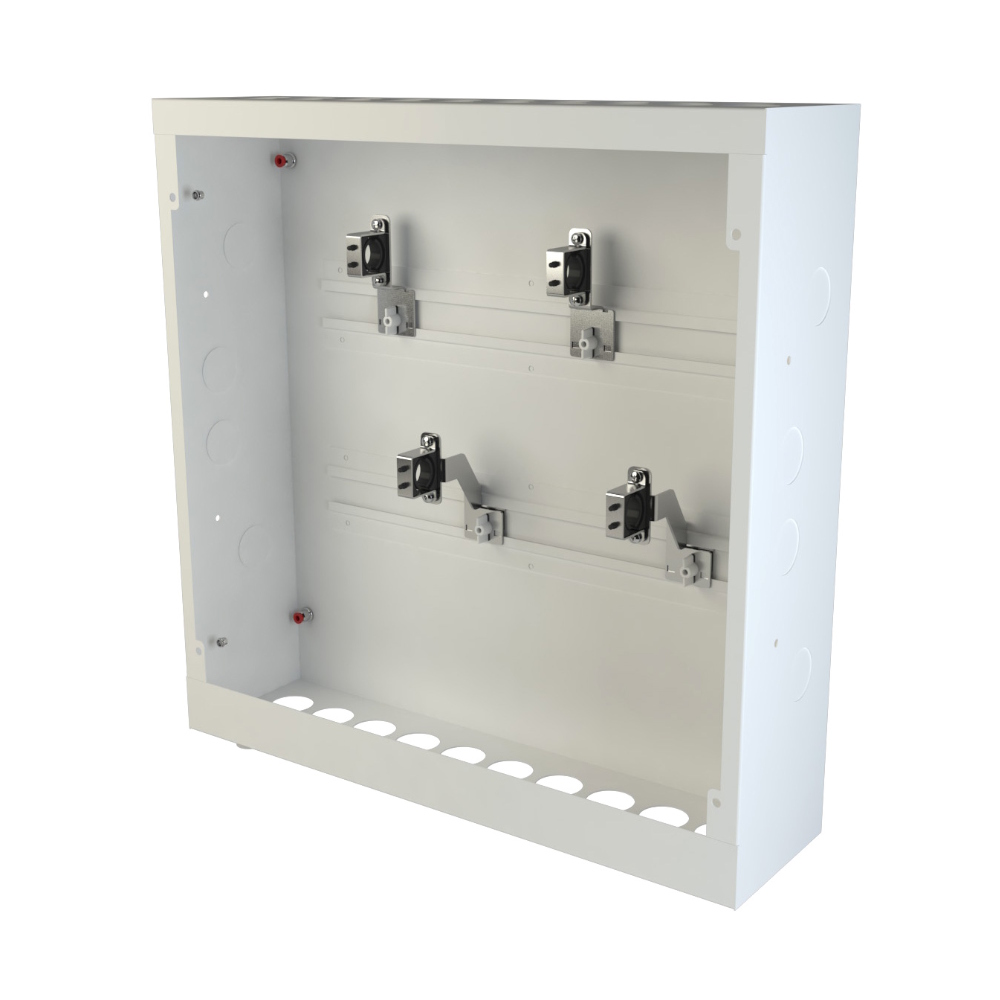 Fordelerskabet UNI 550 XL giver mere plads til isolering af trunkerne og er fremstillet af pulverlakeret stålplade, hvid farve RAL 9016.