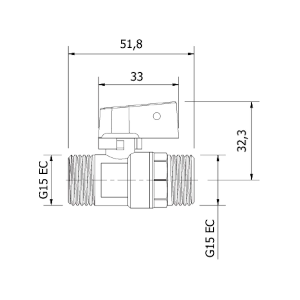 Afspærringsventil i afzinkningsbestandig messing. Udvendigt G15 EuroCone gevind i begge ender. Hul i knappen til markeringsplade.