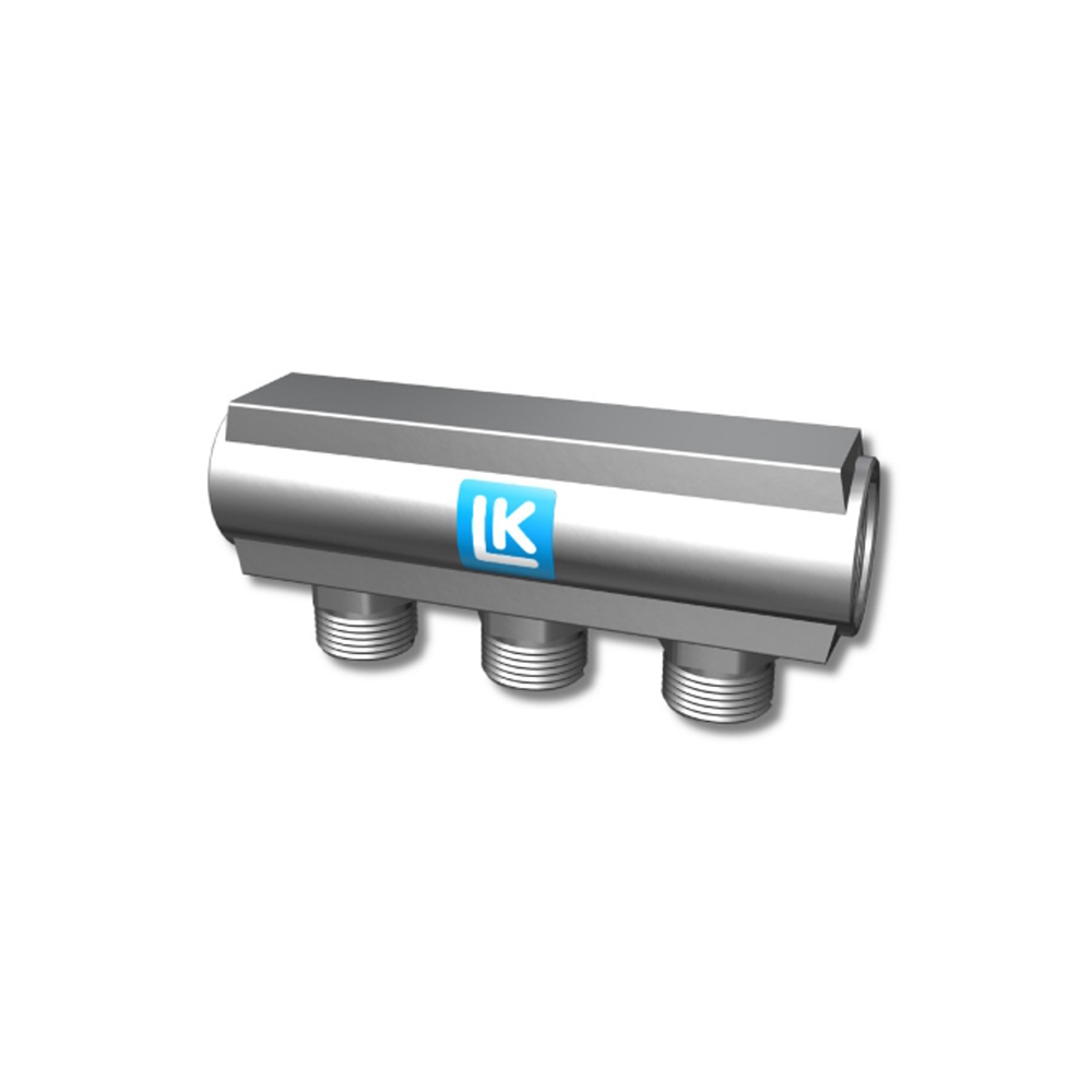 Kompakt returmanifold beregnet til varmesystemer. Den har en hovedtilslutning G20 og tre udløb G15 med 50 mm c/c afstand.
