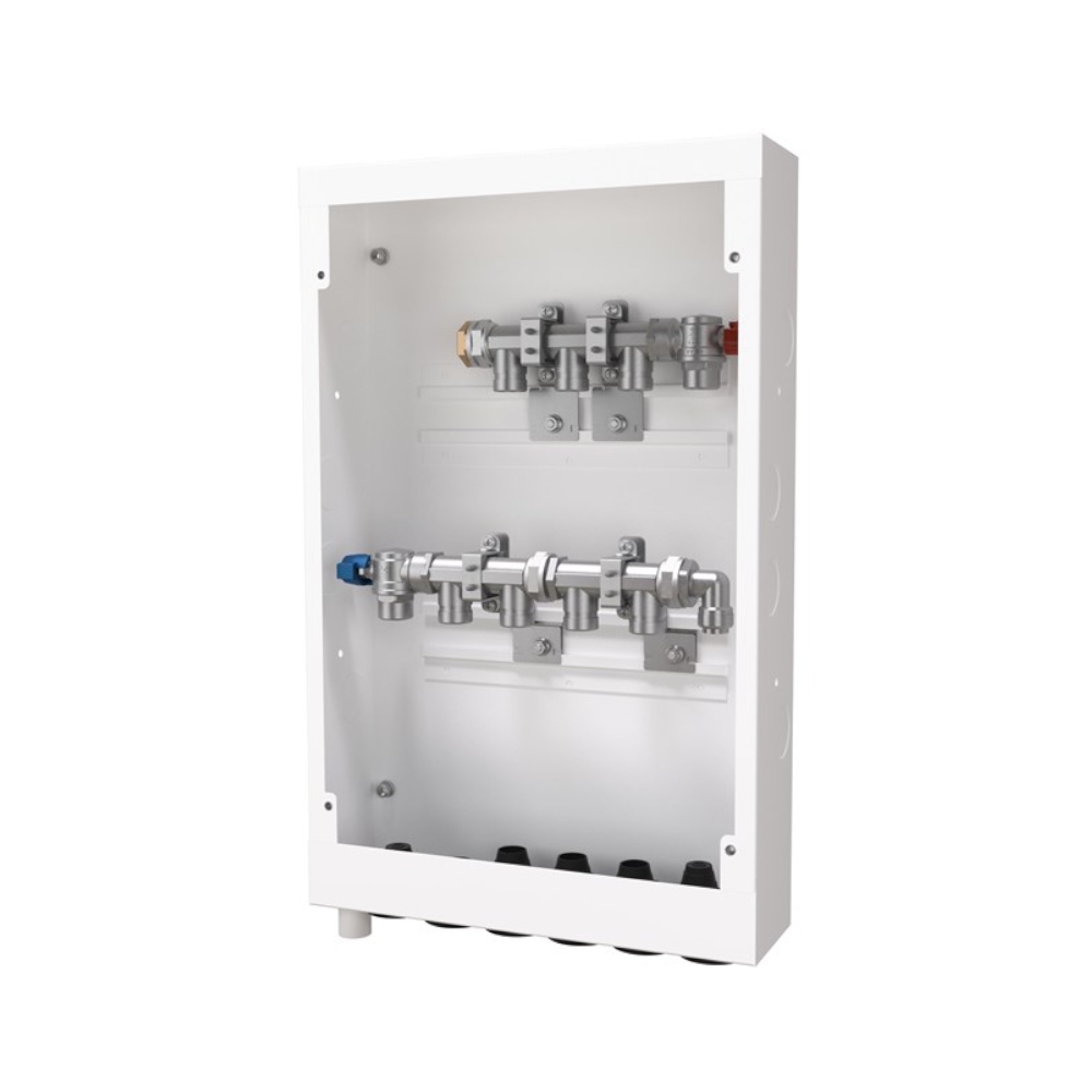 Præfabrikeret skab UNI Push 5/3 er et lækagesikkert præfabrikeret fordelerskab til 5 koldtvandstilslutninger og 3 varmtvandstilslutninger.