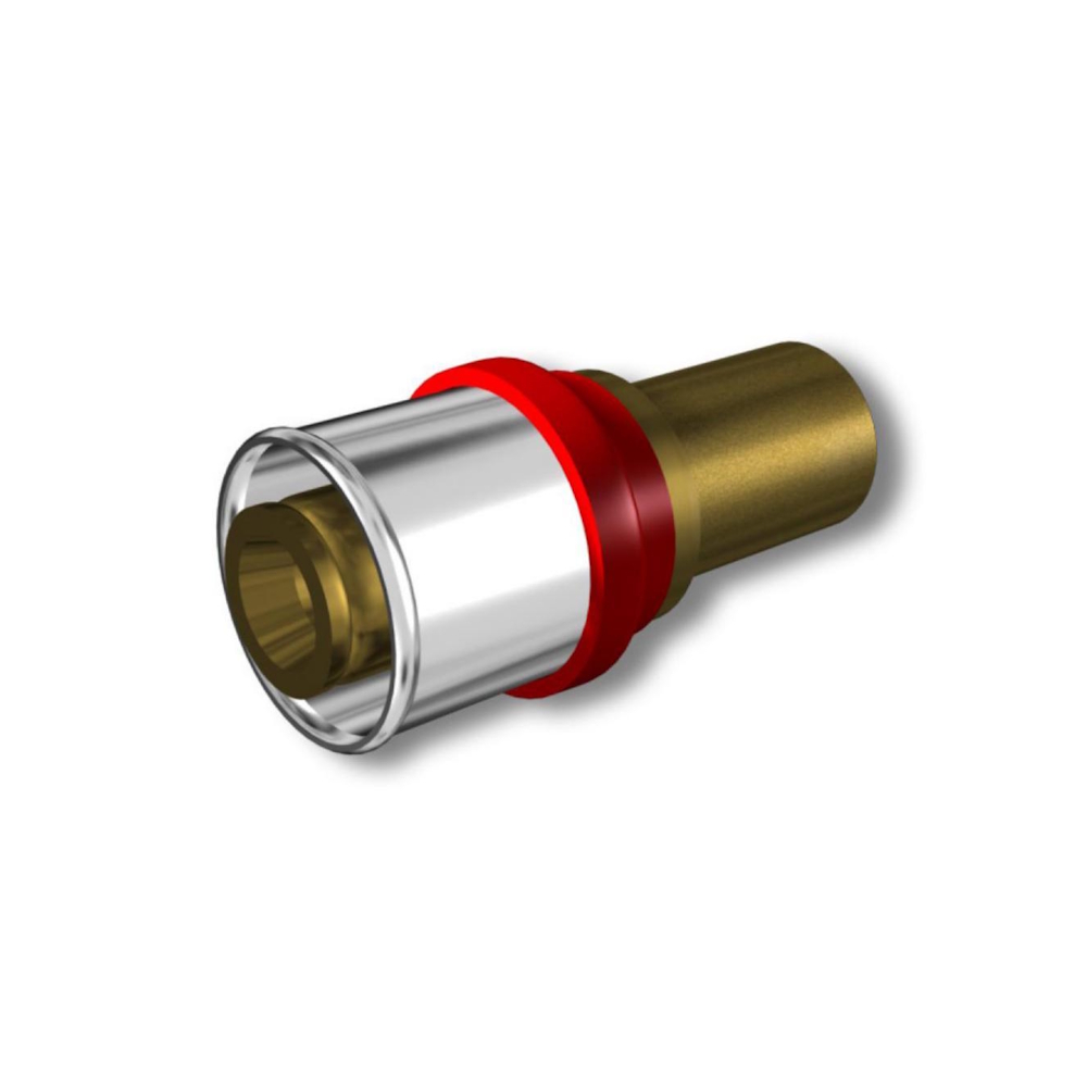 Preskobling til samling af PE-rør. Denne serie omfatter både PressPex-koblinger til universalrør (grå plastring) og PE-M, PE-X-rør (rød plastring). Dimension 25 x 2,3/2,5 til PE-M, PE-X-rør er med rød plastring.