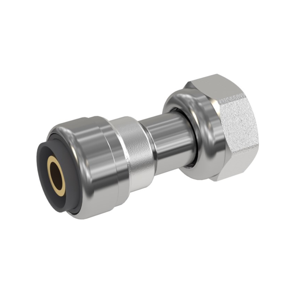 PushFit-kobling med friløbsmøtrik beregnet til LK PE-X og PAL universalrør mod udvendig. EuroCone på f.eks. LK Manifold UNI. Leveres komplet med monteret støttemuffe.