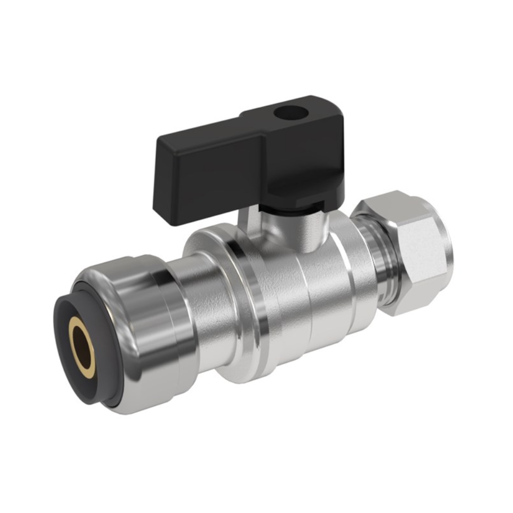Kugleventil med Push-tilslutning beregnet til LK PE-X og PAL Universalrør. Leveres komplet med monteret støttemuffe. På den anden side er der en klemringstilslutning til kobberrør til f.eks. et håndvaskarmatur. Hvis møtrikken fjernes fra klemringstilslutningen, er der et udvendigt G10-gevind til tilslutning af f.eks. en tilslutningsslange fra et armatur med en flydende møtrik og flad pakning.