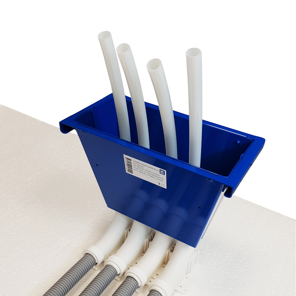 LK Radform anvendes til indbygning i beton. Monter RiR i LK Radbock-støtte (4814367), placer rækkeformen på rækkebock-støtterne og fastgør rækkeformen. Dette giver en fleksibel rørforbindelse under den endelige montering af radiatoren. Der findes flere designs, der passer til radiatorkoblinger og quattro-koblinger. Rækkeformen kan afmonteres efter støbning og genbruges.