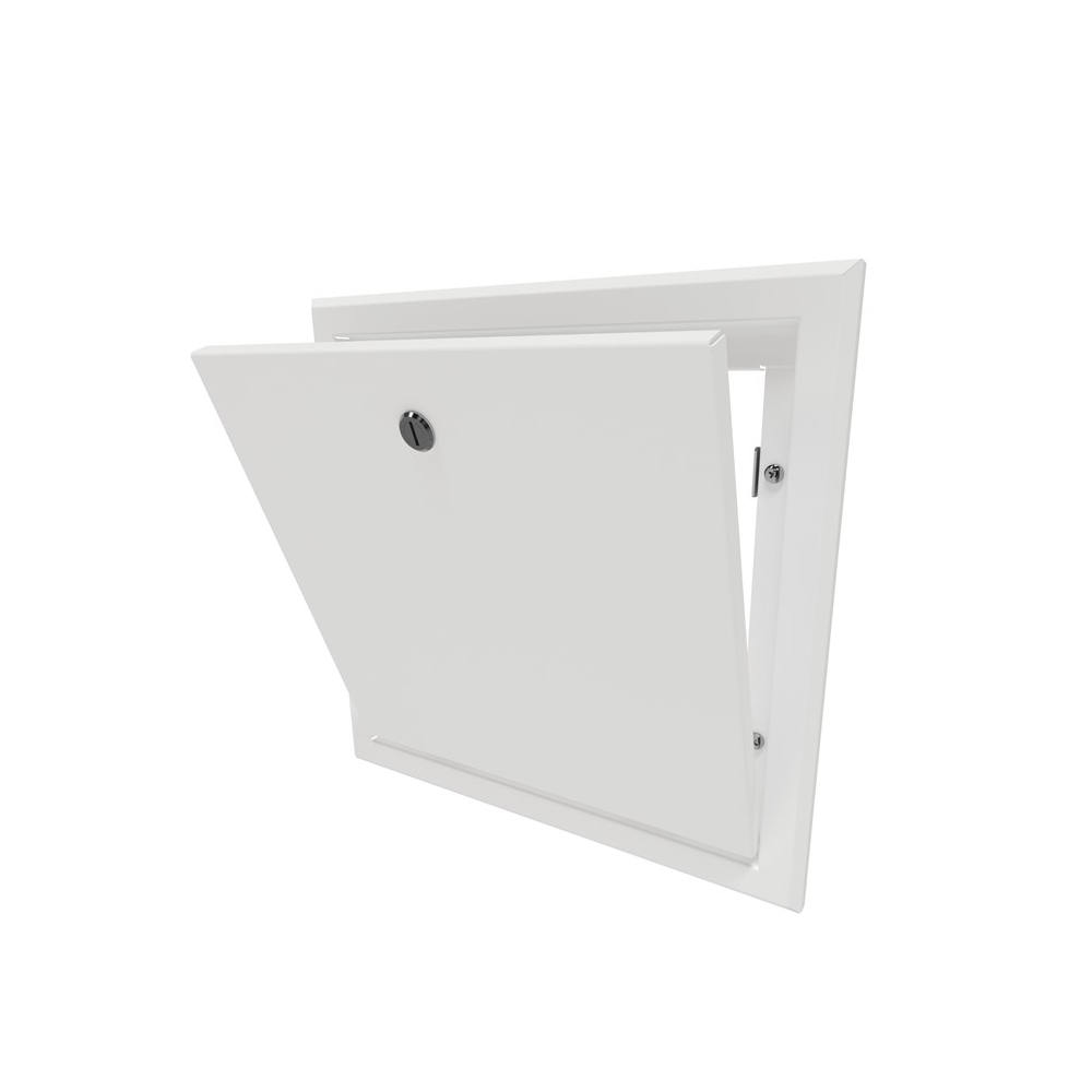 Ramme med dør til LK El-skab UNI monteret udvendigt på væggen. Lavet af 1 mm pulverlakeret stålplade, hvid farve RAL9016. Som standard er døren udstyret med en skruetrækkerlås, og som tilbehør er der en nøglelås.