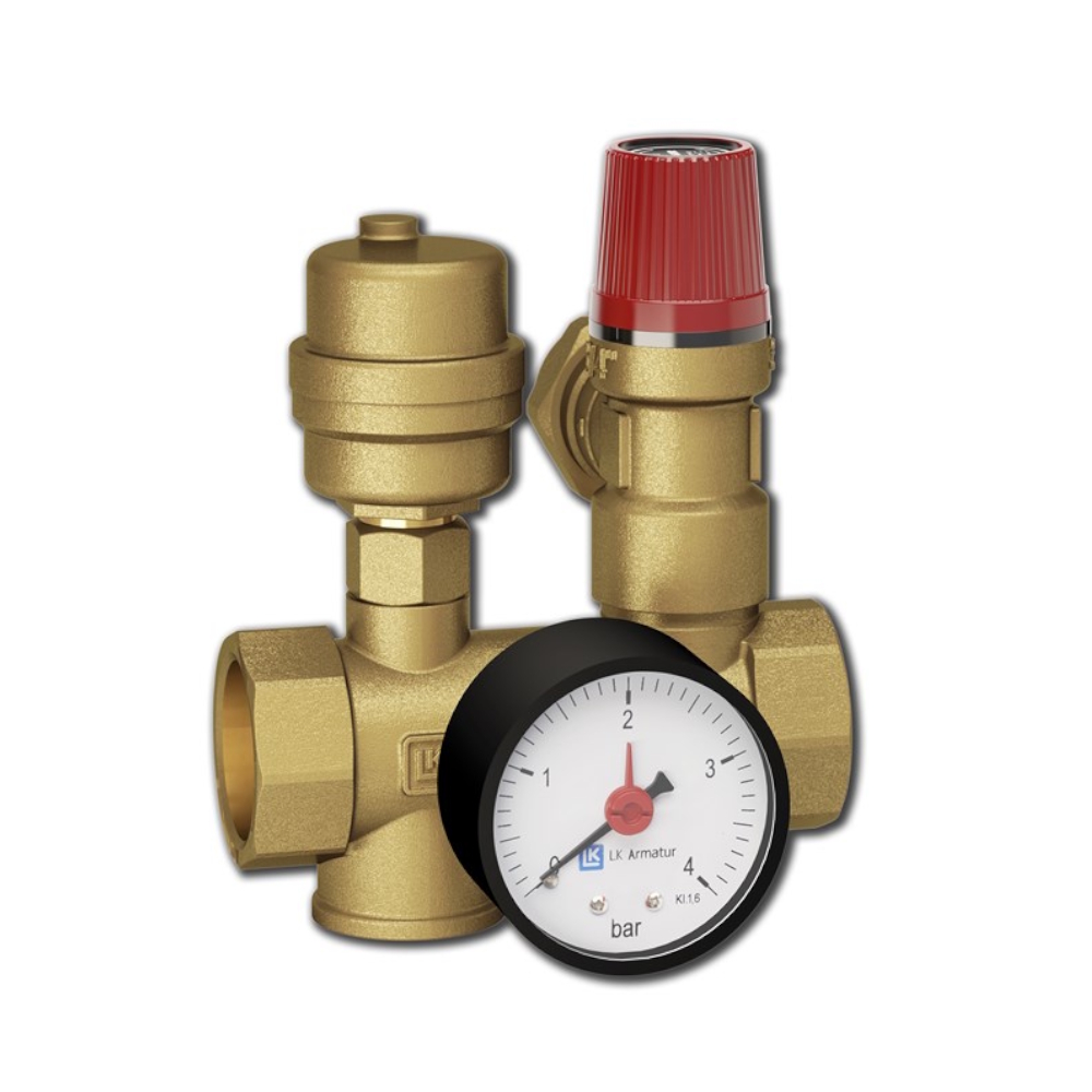 Sikkerhedspakke til varmesystemer indeholdende manifold med lige tilslutning G25, trykmåler, flydeluftudlufter og sikkerhedsventil.