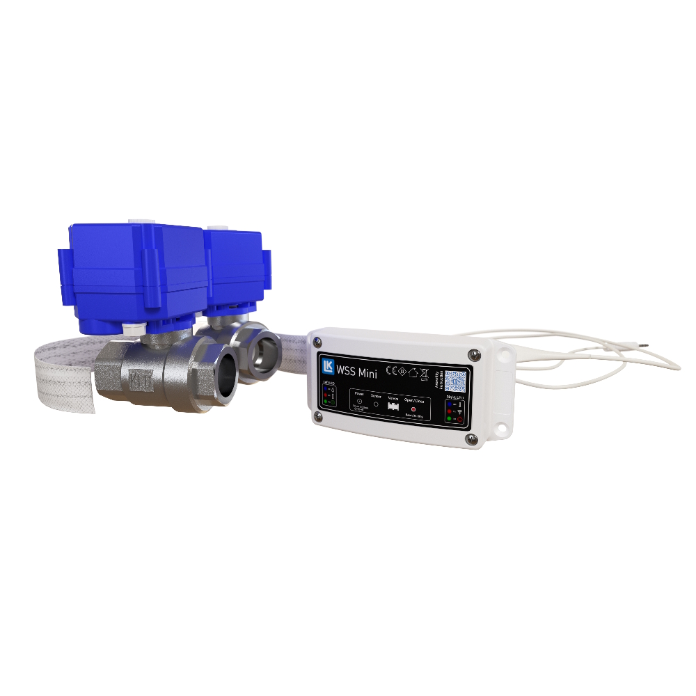 LK WSS Mini Start er en pakke med en hovedenhed, en motorventil G25 og en sensor. Pakken kan bruges, hvor man ønsker at slukke for vandet, når der registreres en vandlækage, for eksempel ved en vanddispenser eller en kaffemaskine. Systemet drives af en 5V netadapter. Det er muligt at tilslutte flere sensorer til detektion over et større område.