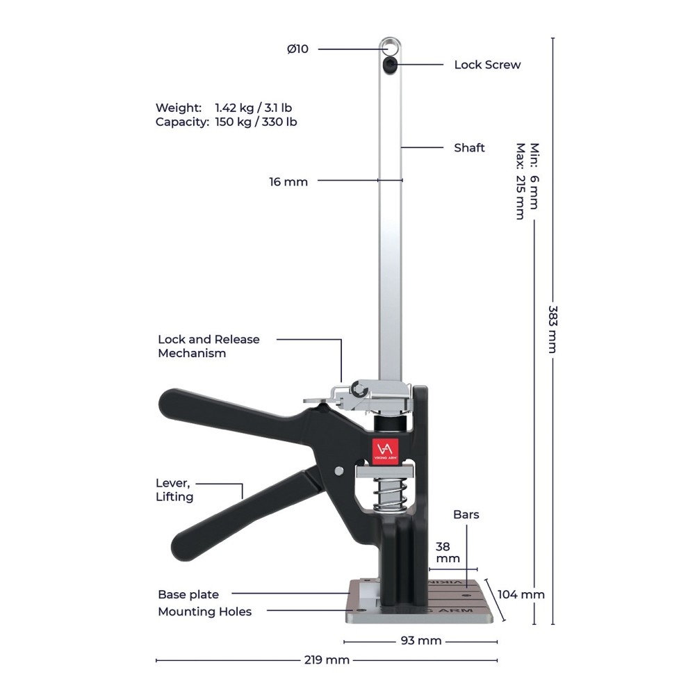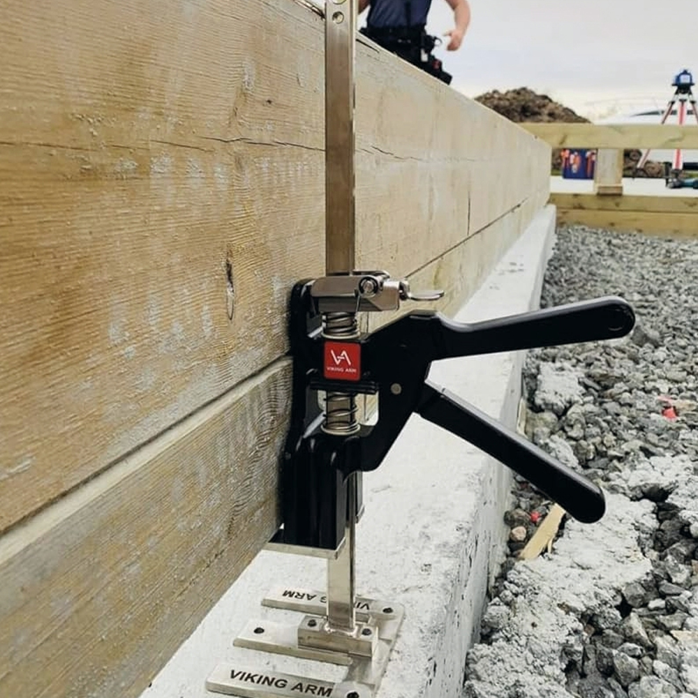 Med dette patenterede værktøj kan du løfte, holde og nivellere laster på op til 150 kg med millimeterpræcision. Dets anvendelsesmuligheder er praktisk talt ubegrænsede, hvilket sparer dig arbejde, tid og din ryg. Det er simpelthen din tredje hjælpende hånd på arbejdspladsen. Installer døre, vinduer, skabe, vægpaneler, gulve, terrasser, fliser, HVAC og elektriske apparater hurtigt og nemt. Lad Viking Arm hjælpe dig med tunge badeværelsesinventar, brusenicher, glasdøre, rør og pumper. Skal du bygge et hus? Du vil nyde at bruge den til indramning, bjælkejusteringer, verandaer og hundredvis af andre anvendelser. Viking Arm leveres med den kraftige 6 mm (0,24 tommer) fod-/bundplade som standard. Tømrerarbejde og installation har aldrig været nemmere.