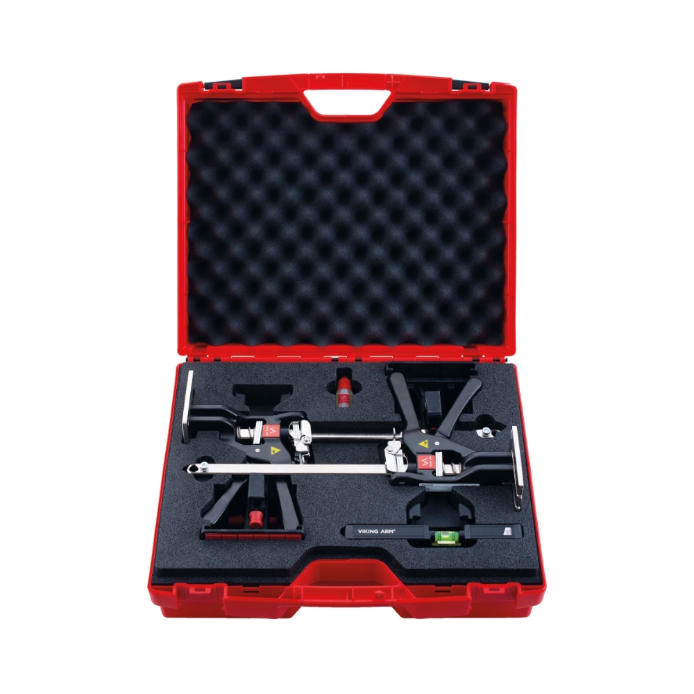 Viking Arm løfte- og klemmesæt. Montering i en stærk hård plastkasse i PP med kliklås og EVA-skum. Indeholder 2 Viking Arms, 2 komplette skabe og monteringssæt med 2 bundplader og 2 løfteplader, mineralolie og hård plastkasse til tilbehør.