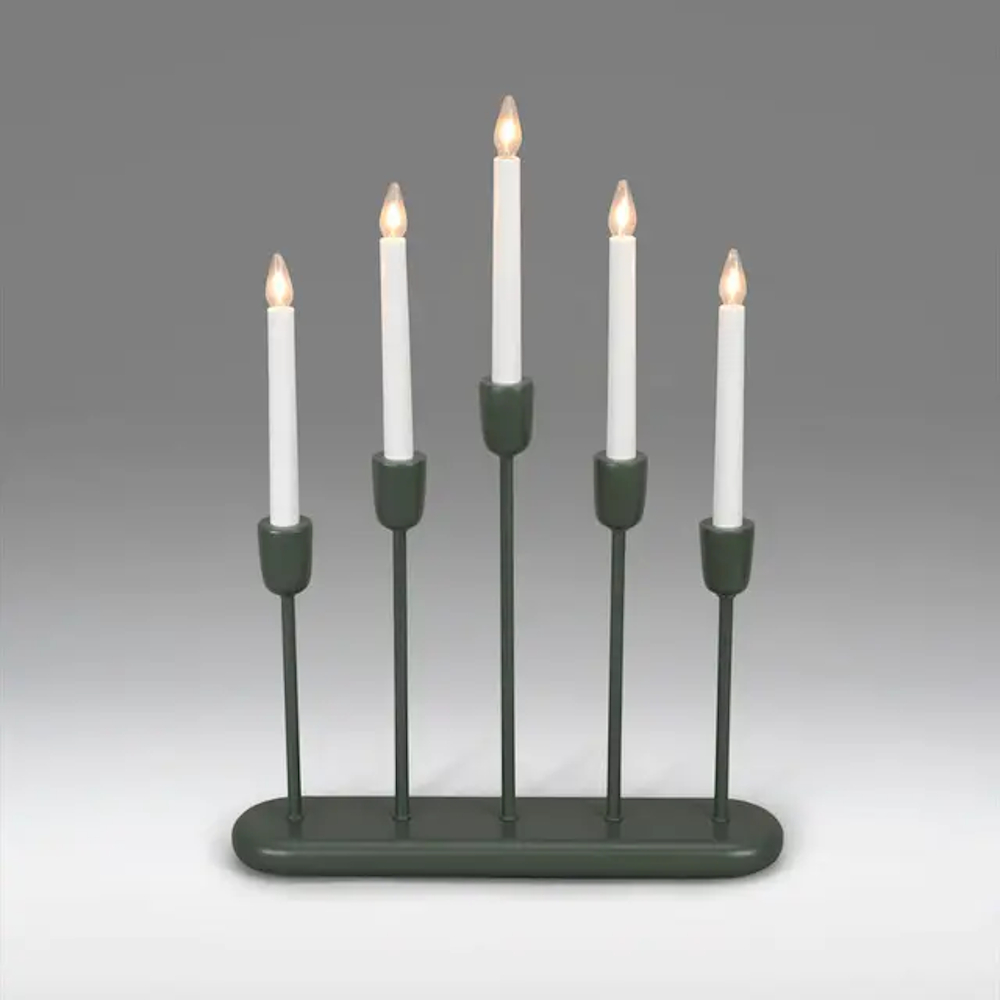 Elegant 5-armet adventslysestage med varme hvide LED'er. Grøn i træ og metal. Tilslutningsledning på 1,7 meter.