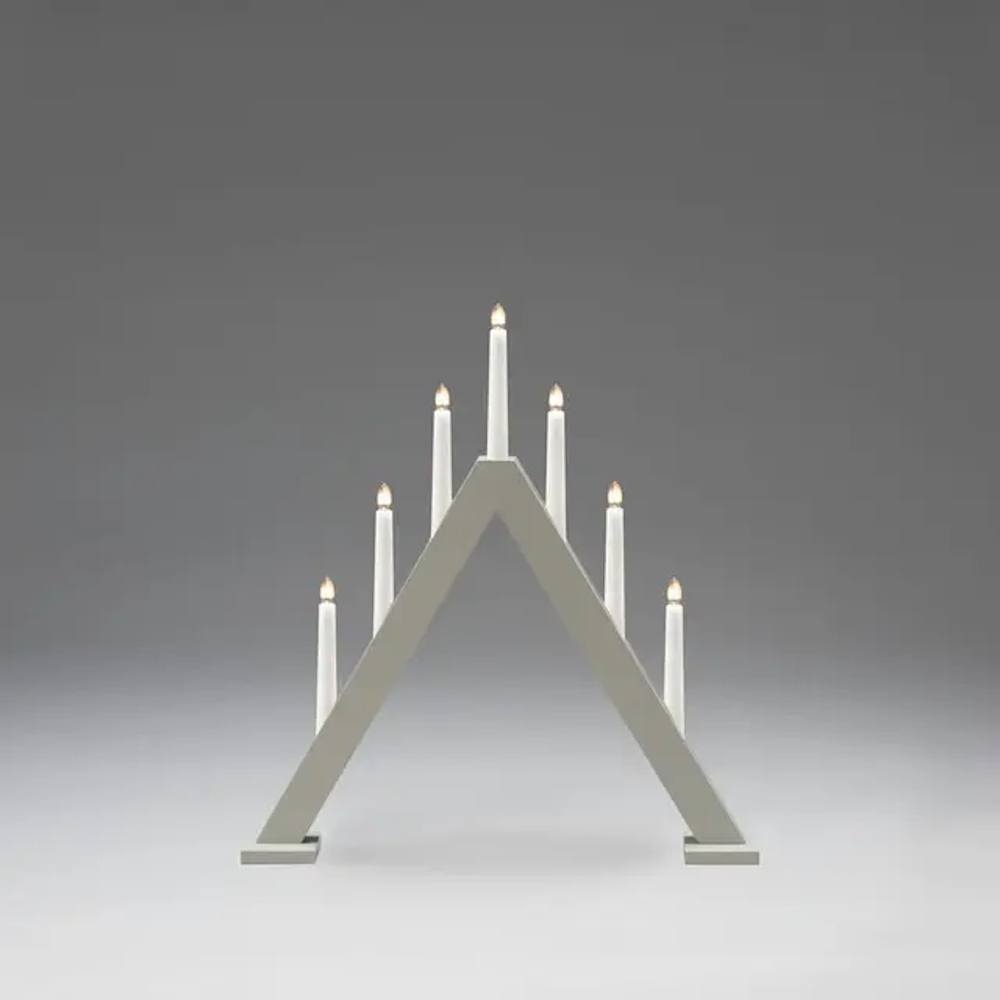 Klassisk 7-armet lysestage i træ med varme hvide lamper. Lakeret i en mat grå farve. Tilslutningsledning på 1,7 meter.
