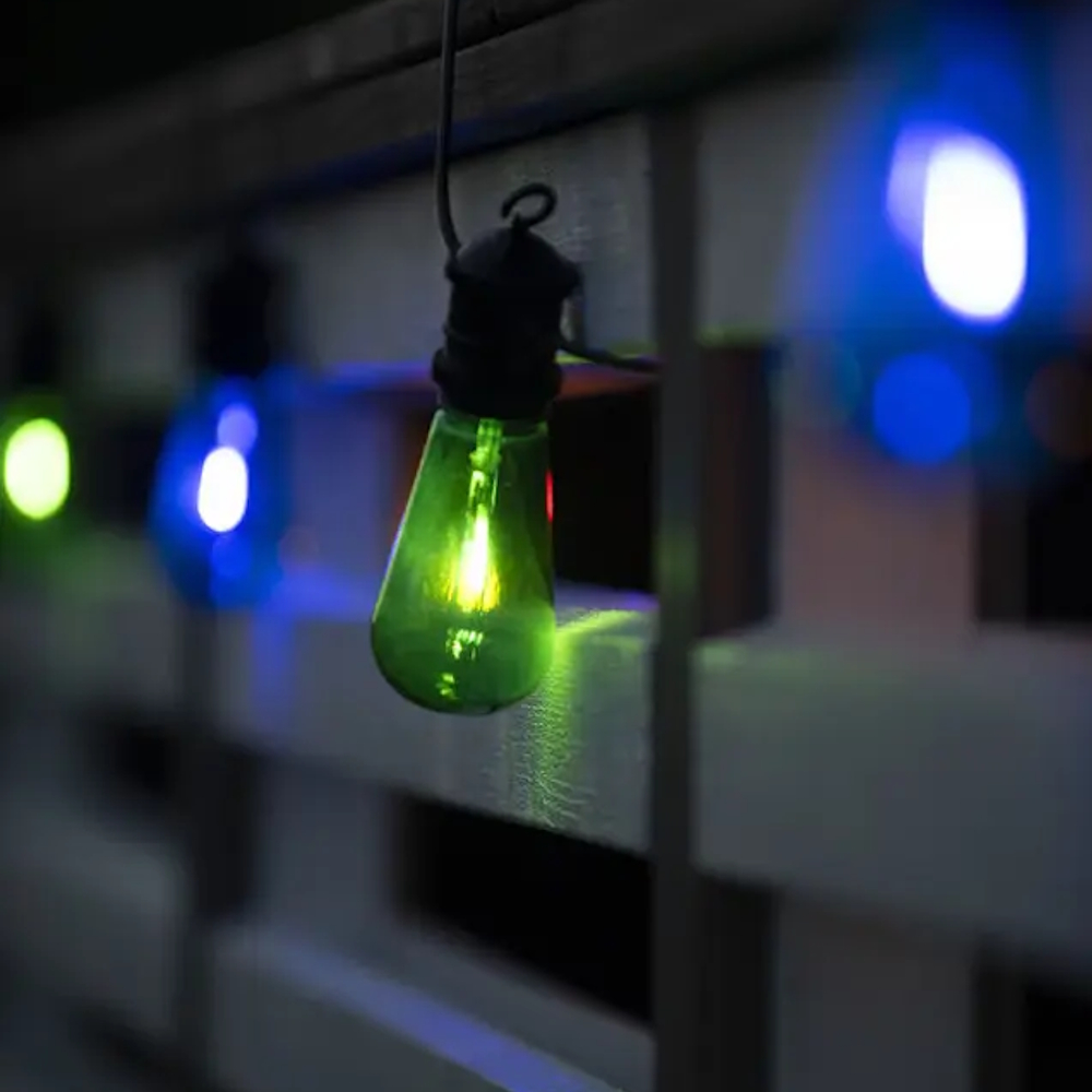 Festlyskæde til terrassen eller markisen, med 10stk farvede og udskiftelige LED-lys med vanddråbeeffekt. E27. Lampeafstanden er 50 centimeter. Forbindelseskablet er 10 meter, hvilket giver en samlet længde på 14,5 meter.