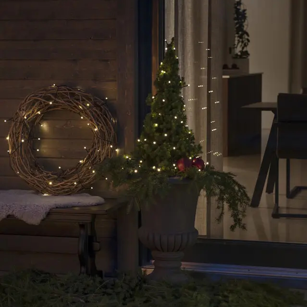 Lyskæde fra Konstsmide med 40 varm hvide LED-lys. 6 timer. Drevet af 4xAA-batterier (medfølger ikke). Kæden er 4,4 m lang og har en 0,5 m lang forbindelsesledning til den første lampe. Til udendørs brug.