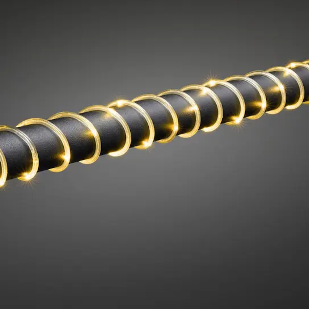 Mini lysslange fra Konstsmide med ravfarvede LED-lys og transparent slange, lysslangen har en skumringssensor.