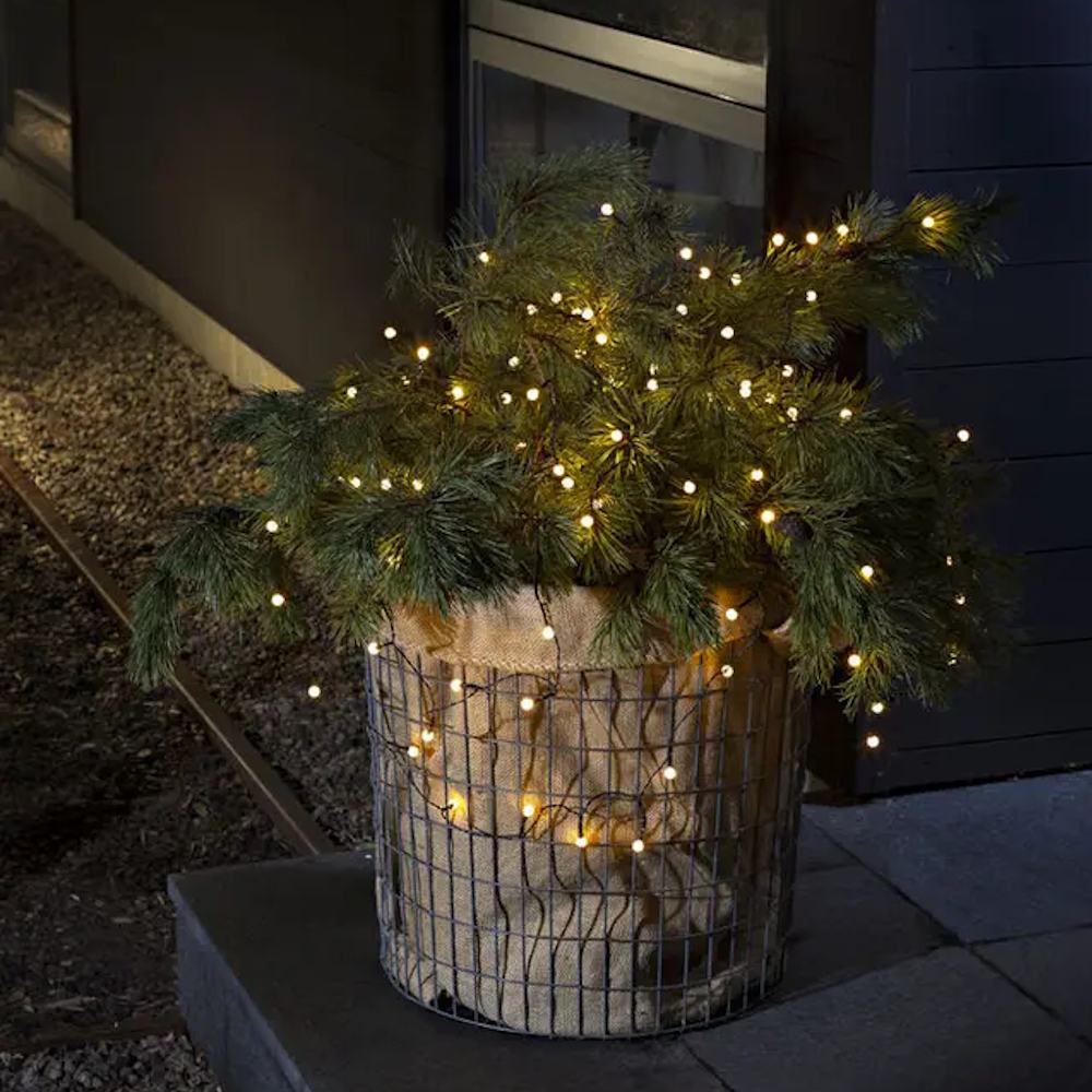 Indendørs og udendørs, med automatisk skumrings-til-daggry-funktion og timerfunktion med automatisk slukning efter 6 eller 9 timer, batteriboks med afbryder og ophængningsstrop, kabel og stikkontakt sort, IP44, batteridrift 4 Mignon. Afstand mellem lamperne 10 cm.