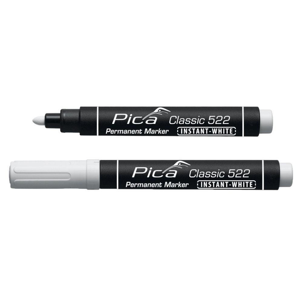 Pica Classic permanent pen "instant white". Det hvide blæk markerer øjeblikkeligt, uden at ryste eller pumpe. Markerer på næsten alle overflader, permanent vandbaseret blæk. Vejrbestandig og slidstærk efter ca. 20 sekunder. Økonomisk alternativ til hvide farvede penne. Fri for xylen og toluen.