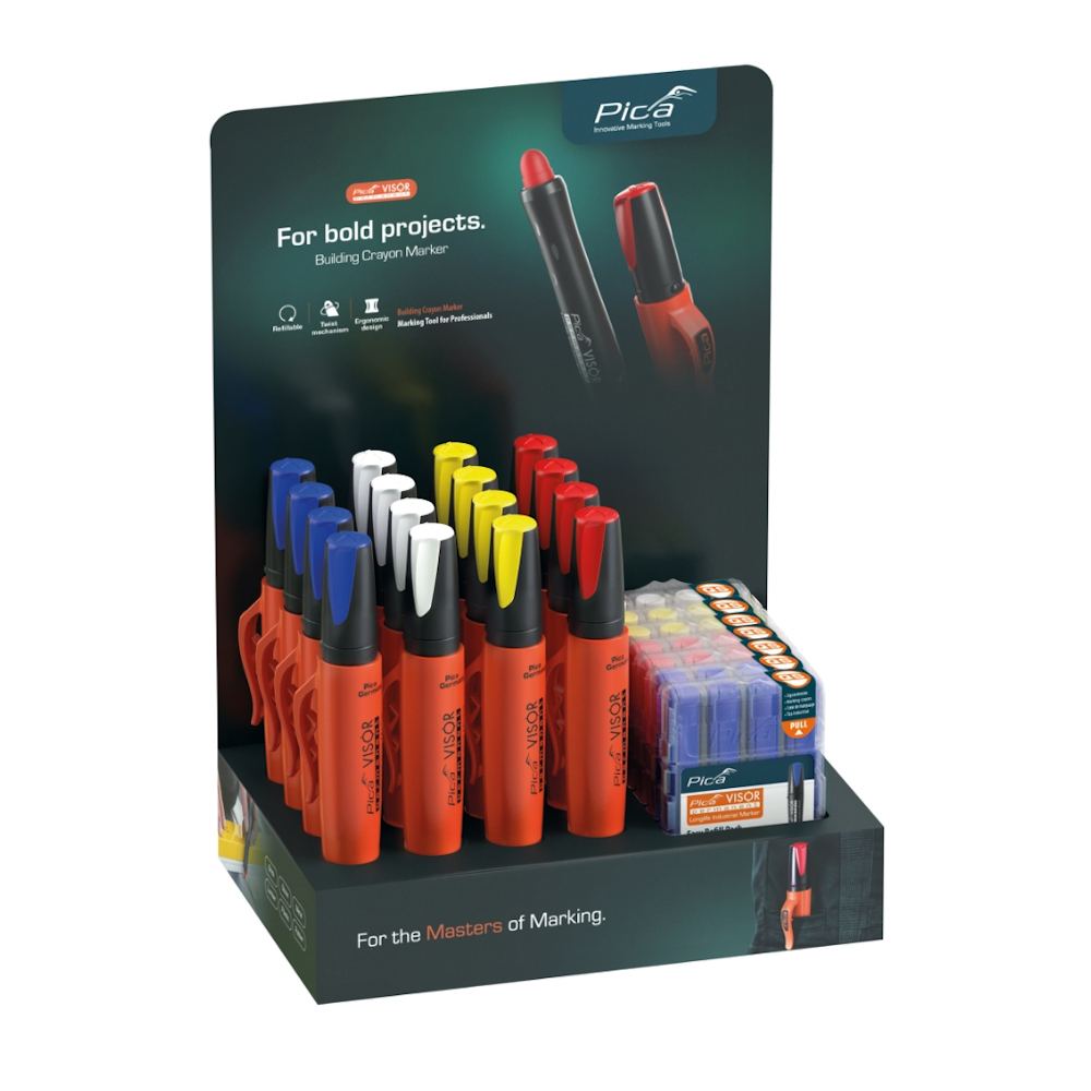 Pica Visor permanent markeringskridt. Klæber til alle materialer, både tørre/våde, skinnende og ru overflader. Alsidig og vandtæt.