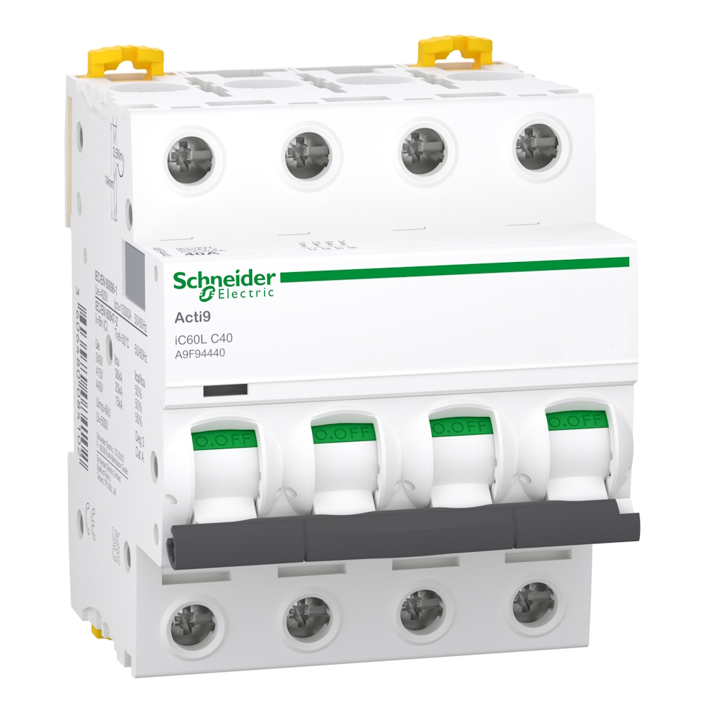 Acti9 iC60L er en lavspændings miniatureafbryder (MCB). Den har 4 poler med 4 beskyttede poler, mærkestrøm på 40A og C-udløsningskurve. Den nominelle kortslutningsbrydekapacitet går op til 36kA ved 220V til 240V AC i henhold til EN/IEC 60947-2-standarden og 15.000A ved 400V AC i henhold til EN/IEC 60898-1-standarden. Den overholder både industristandarden EN/IEC 60898-1 og boligstandarden EN/IEC 60947-2. Denne miniatureafbryder beskytter mod kortslutning og overbelastningsstrøm i alle applikationer. Den unikke VisiTrip-indikator reducerer indgrebstiden ved at vise den fejlramte kreds. VisiSafe-grønstriben garanterer en fysisk åbning af kontakterne for at muliggøre vedligeholdelse nedstrøms. Den hurtige lukkemekanisme, som er uafhængig af manuel betjening, forbedrer dens levetid. Den har en elektrisk holdbarhed på op til 10.000 cyklusser og en mekanisk holdbarhed på op til 20.000 cyklusser. Den nominelle isolationsspænding (Ui) er 500V AC. Begrænsningsklasse 3 (ifølge EN/IEC 60898-1) forbedrer beskyttelsen af nedstrøms kredsløb og reducerer omkostningerne. Den er DIN-skinne monterbar og har en bredde på 8 moduler à 9 mm. Forureningsgrad er 3. Overspændingskategori er IV. Ifølge IEC 60529-standarden er beskyttelsesklassen IP20 og IP40 i kapsling. Driftstemperatur er -35°C til 70°C. Opbevaringstemperatur er -40°C til 85°C.