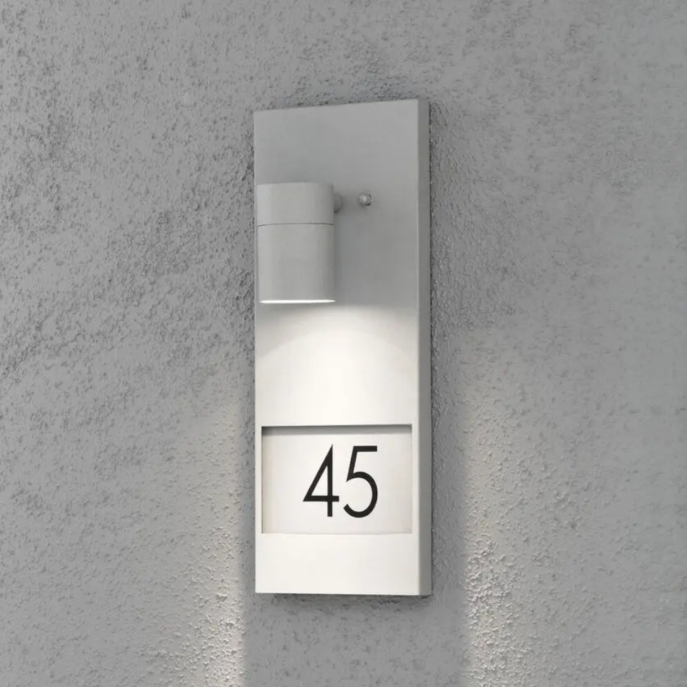 Modena facadebelysning i grå aluminium, stilfuld belysning med plads til dit husnummer, leveres med 3 sæt af tallene 0-9.