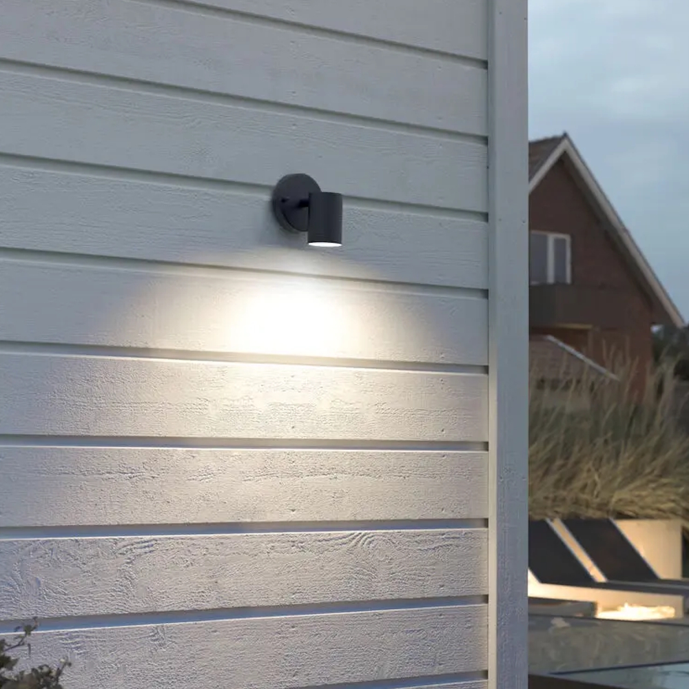Facadebelysning i sortlakeret aluminium, en stilfuld udendørslampe hvor lyset er rettet nedad for et effektivt lysmønster. [Energiklass F]