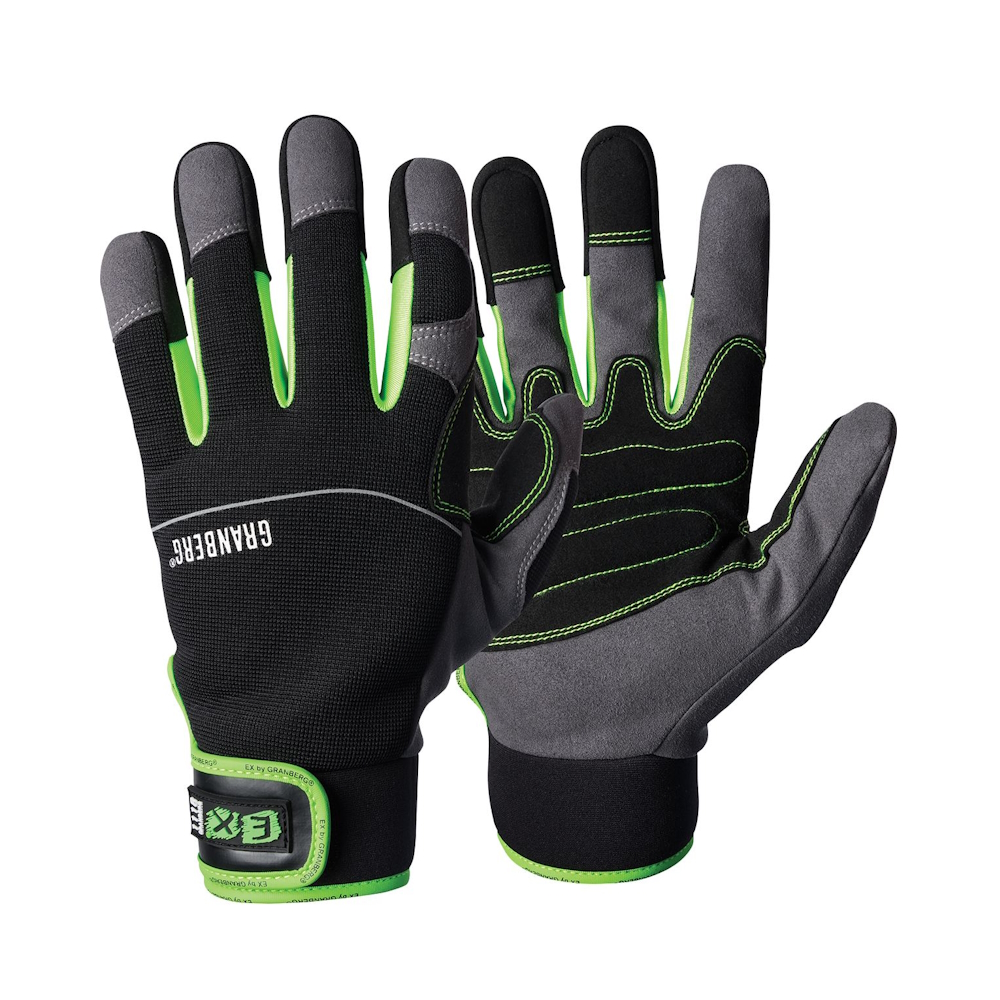 Robuste og slidstærke monteringshandsker lavet af syntetisk materiale, forstærkninger i håndfladen og på fingerspidserne, maskinvaskbare.