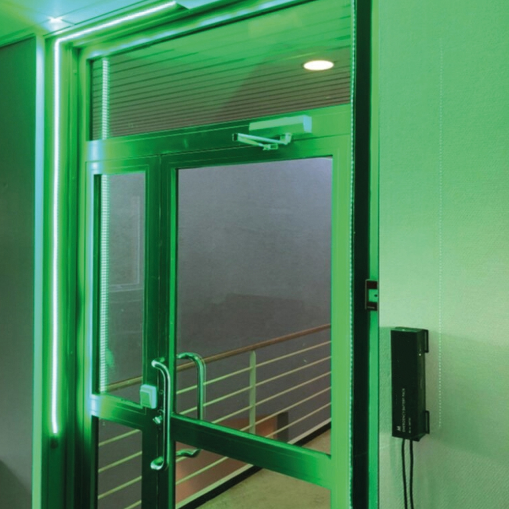 Grøn LED-nødlysstribe på 5 meter, der enten kan tilsluttes en 220V stikkontakt eller tilsluttes enden af en eksisterende Flex-Line LED-stribe i enhver længde, eller direkte til Flex-Line nødlysbatteriet, varenummer 690632. Den grønne LED-stribe bruges f.eks. til tydeligt at vise, i hvilken retning den nærmeste udgang er, eller omkring selve nødudgangen. Leveres i en papkasse. Når du tilslutter striben til nødlysbatteriet (enten direkte eller i enden af en eller to LED-striber), lyser hele den tilsluttede LED-stribe op ved hjælp af batteriet mellem 10-20% i maksimalt 1,5 timer, når strømmen er tændt.