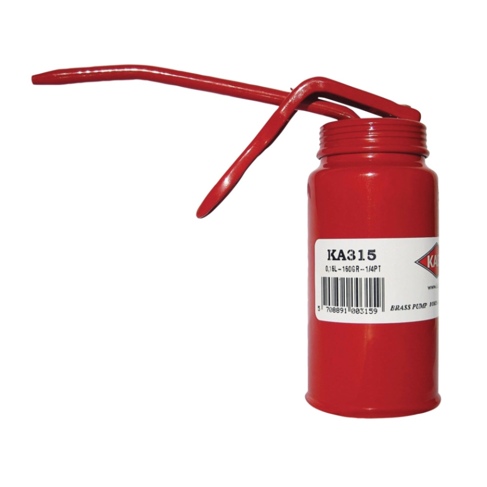 Lige ståltud med buet top og konisk nippel. Oliedunke med lang levetid og højt pumpetryk, primært på grund af den patenterede pumpe i messing, der er placeret i hver dåse. Stærk ovnlakeret beholder med konisk nippel på hver tud for bedste tilgængelighed.