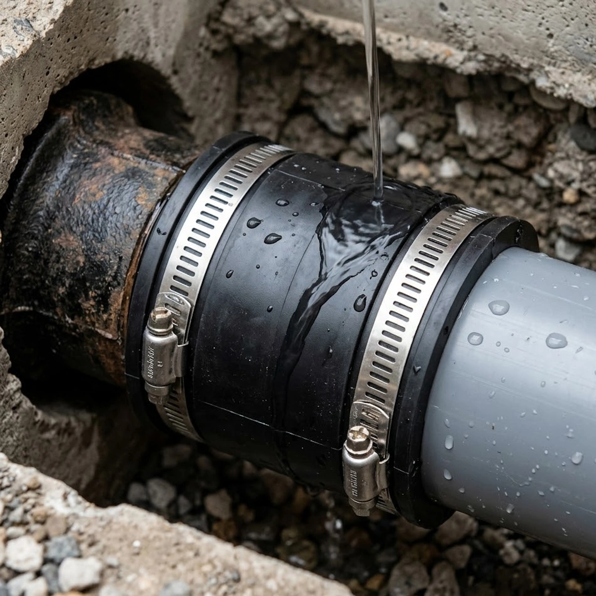 Fleksibel overgangskobling til samling af MA 50 til plastrør. Lavet af vejrbestandigt gummi med syrebestandige spændebånd for maksimal holdbarhed.