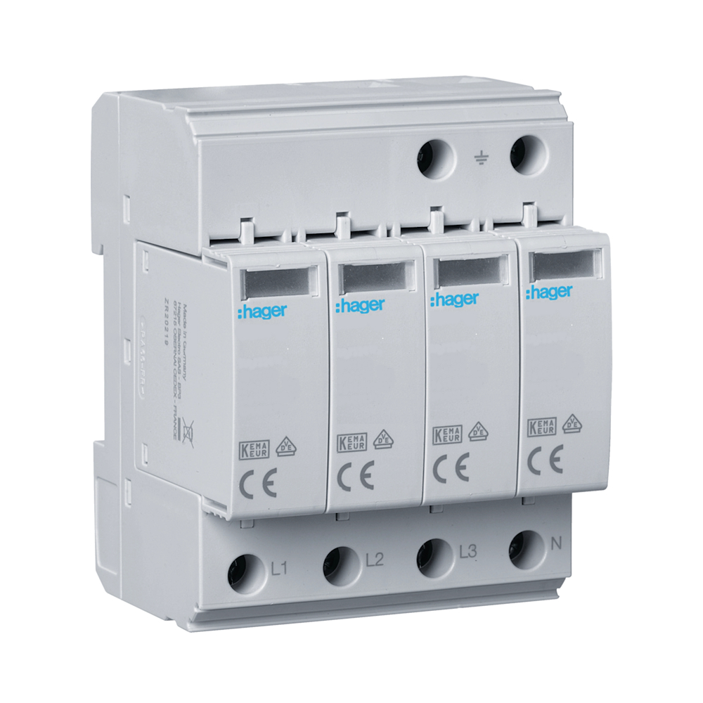 Hager Overspændingsbeskyttelse T2 TT/TNS Indikator: 4-polet, 40kA maks. afladning, 230-400V. Klasse T2 beskyttelse til TN-S/TT netværk. Spændingsniveau op til 1,35kV, indgang 20kA. Temperatur -40-80°C. Kompakt, pålidelig overspændingsbeskyttelse.