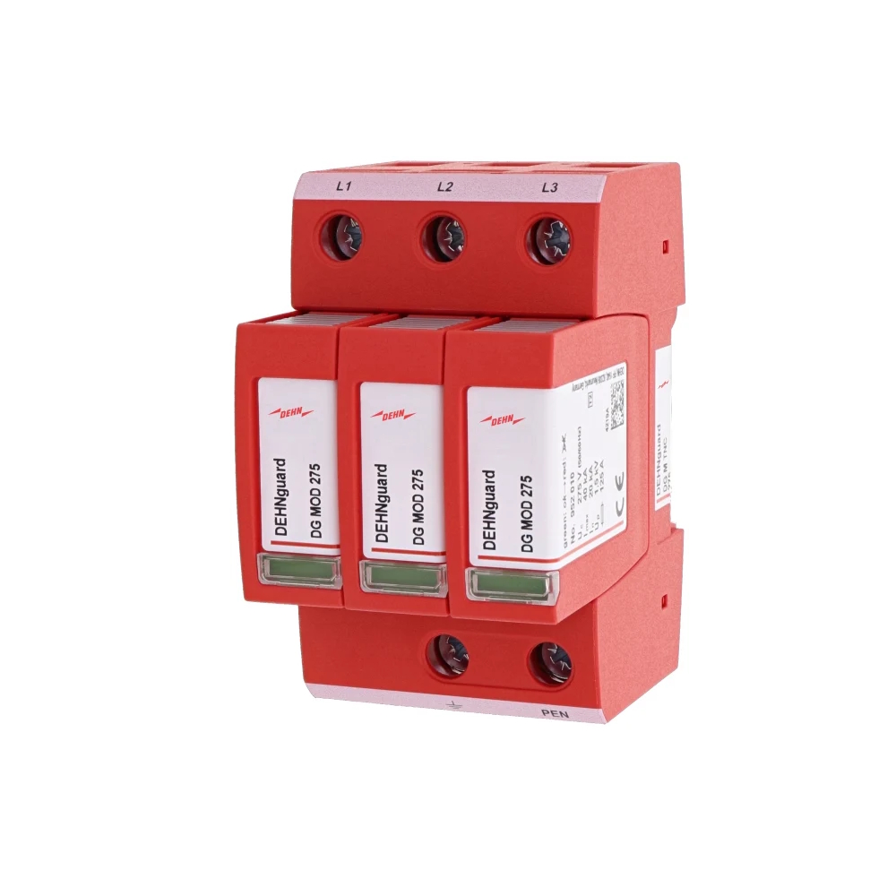 Dehn guard er en mellemliggende beskyttelse (Type 2). Til installationer på indgående linjer i systemer uden ekstern lynbeskyttelse og som supplerende beskyttelse i understationer og styreskabe mv. 3-polet beskyttelse til TN-C (3+0 konfiguration). Optisk indikation med grønt/rødt indikatorflag.