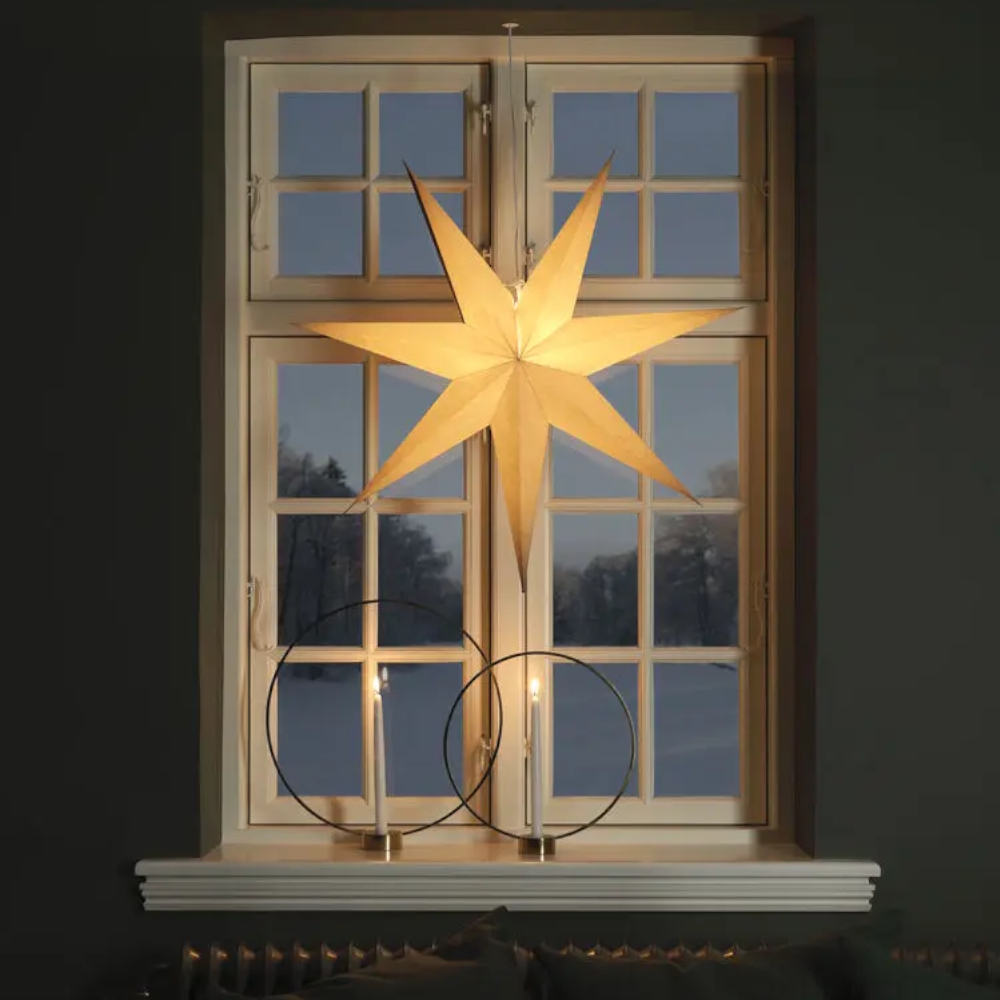 Hængende adventsstjerne med 7 punkter. Ledningsholder med 5 meter tilslutningsledning inkluderet, E14-fatning. Ledningsafbryder. Diameter 78cm.