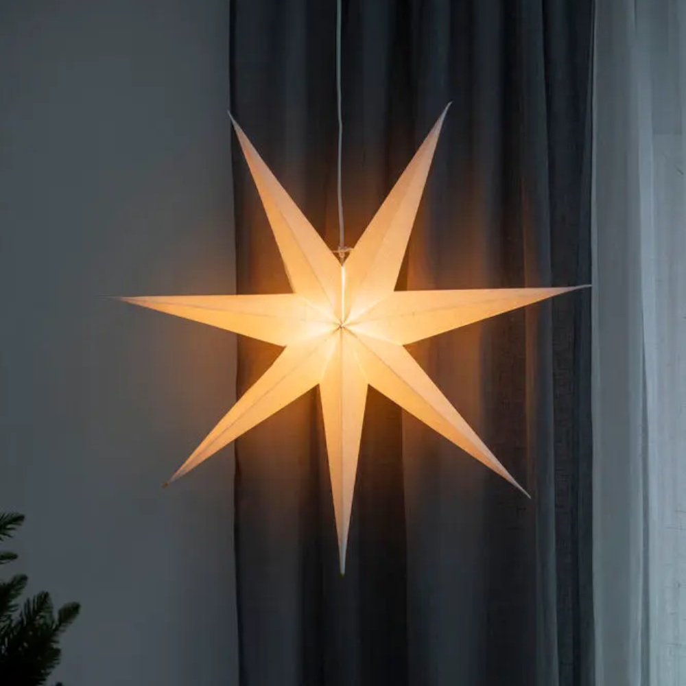 Klassisk adventsstjerne i hvidt papir med smuk tekstilstruktur. Leveres med praktisk ledningsholder og hvid ledning med afbryder. Dekorativ detalje, der skaber en varm, hyggelig og hjemlig julestemning.