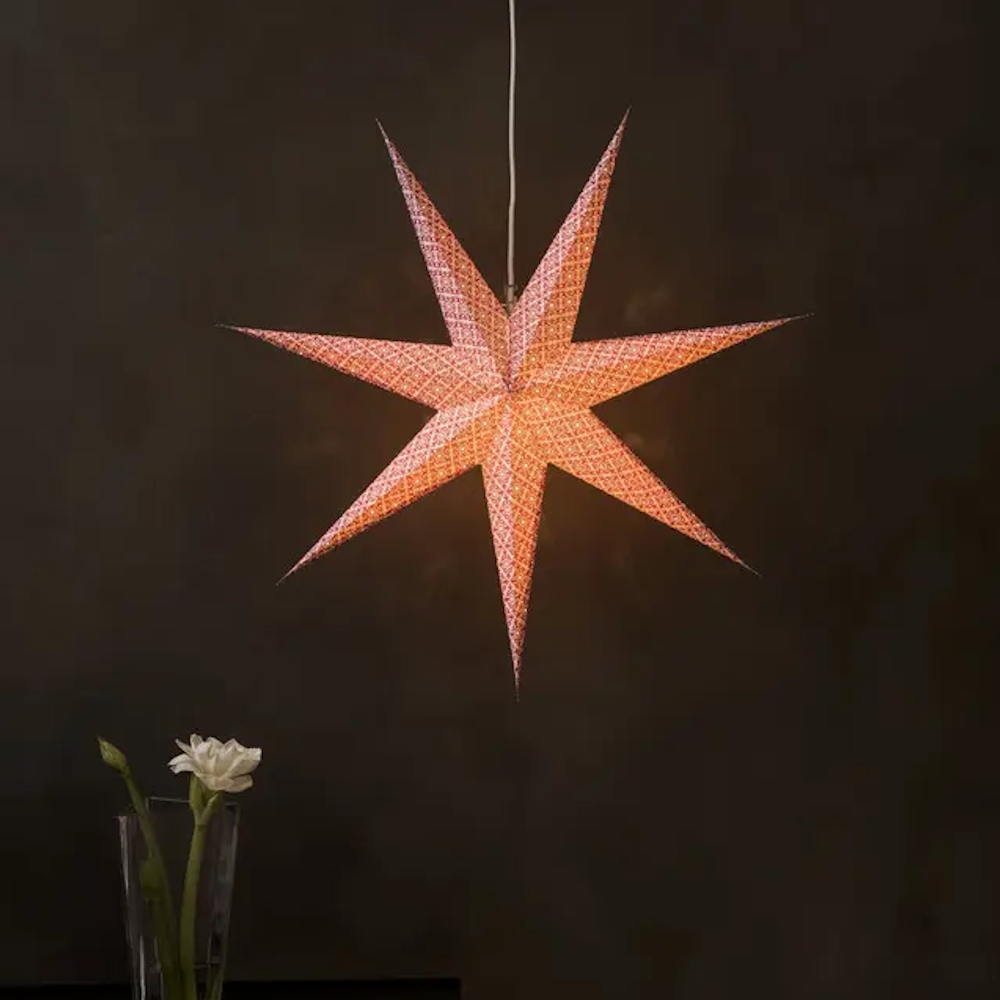 Hængende papirstjerne fra, mål 78x78cm, inklusive ledningsstativ og 5m tilslutningskabel.