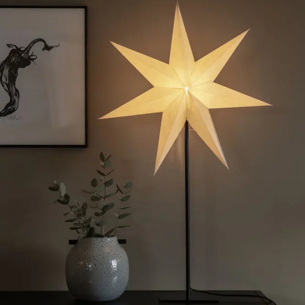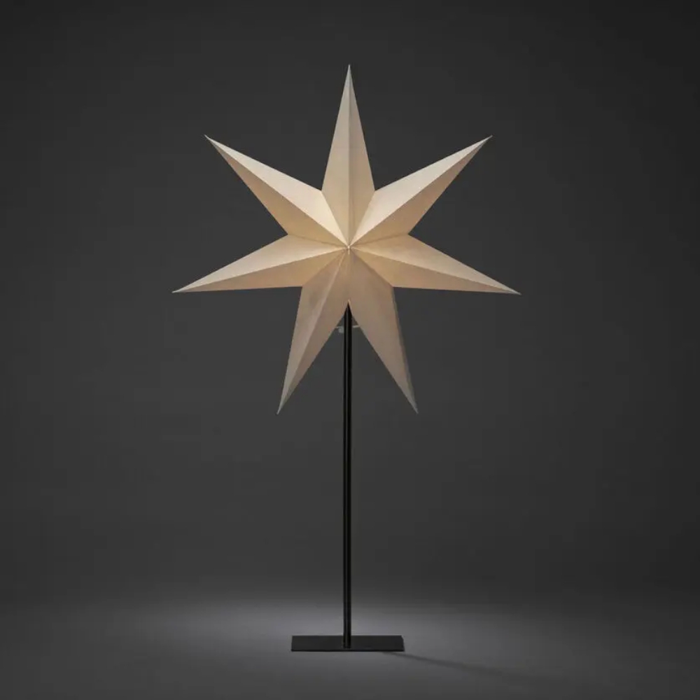 Adventsstjerne med 7 punkter på sort metalbase. 2,4 m tilslutningsledning med ledningsafbryder. E14-fatning (lyskilde medfølger ikke). Diameter 50 cm, højde 80 cm.