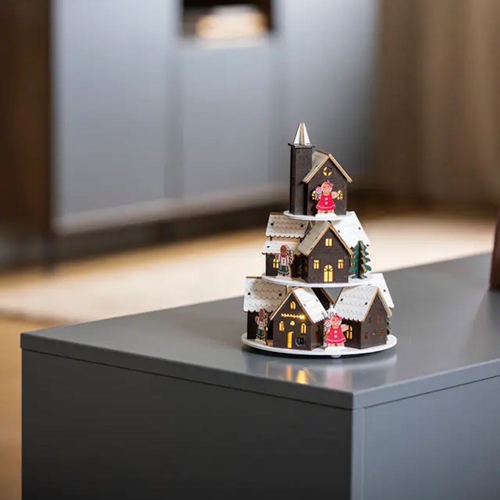 Spred julestemningen med denne charmerende julelandsby! Med peberkagehuse, små peberkagemænd og et smukt vinterligt miljø indfanger den følelsen af en klassisk jul i miniature. De detaljerede figurer i træsilhuet skaber en varm og indbydende atmosfære. Takket være den praktiske 6-timers timer og muligheden for batteridrift eller USB-tilslutning kan du nemt placere den præcis, hvor du vil.