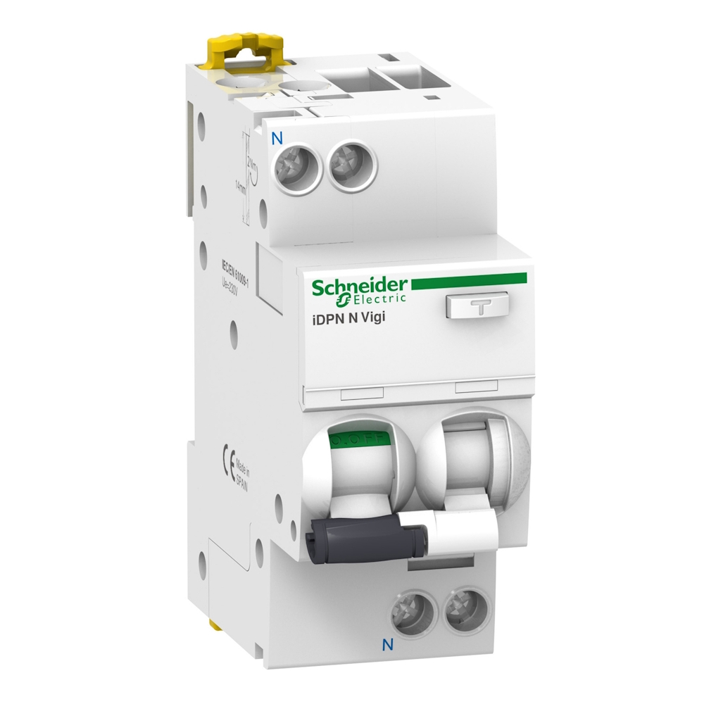 Denne Acti9 iDPN Vigi er en modulær reststrømsafbryder med overstrømsbeskyttelse (RCBO). Det er en 1polet+neutral afbryder med 1 beskyttet pol, 20A i mærkestrøm og C udløsningskurve. Jordafledningsbeskyttelsesklassen er AC-type med en følsomhed på 30mA. Tidsforsinkelsen for jordlækagebeskyttelse er øjeblikkelig. Icn-klassificeret kortslutningsbrudkapacitet er op til 6000A i henhold til EN/IEC 61009-2-1 standarden. Dette produkt beskytter mod kortslutning, kabeloverbelastning, elektrisk stød ved indirekte kontakt og brandfare. Dens jordfejlsindikator på forsiden muliggør hurtig identifikation af standardtypen. Det giver en sikker, pålidelig løsning til kommercielle og industrielle applikationer med høj brudkapacitet. Dette produkt er i overensstemmelse med EN/IEC 61009-2-1 standarden. Den har en elektrisk udholdenhed, der går op til 20.000 cyklusser og en mekanisk udholdenhed, der går op til 20.000 cykler. Ue-driftsspændingen er 220VAC til 240VAC. Ui nominelle isolationsspænding er 400VAC. Uimp-mærket impulsmodstandsspænding er 4kV. Frekvensen er 50Hz. Den kan monteres på DIN-skinne. Bredden i 9 mm afstande er 4. Den har en IP20-beskyttelsesgrad. Det bliver IP40 én gang i modulært kabinet i henhold til IEC/EN 60529 standard. Driftstemperaturen er fra -5°C til 60°C. Opbevaringstemperaturen er fra -40°C til 85°C.
