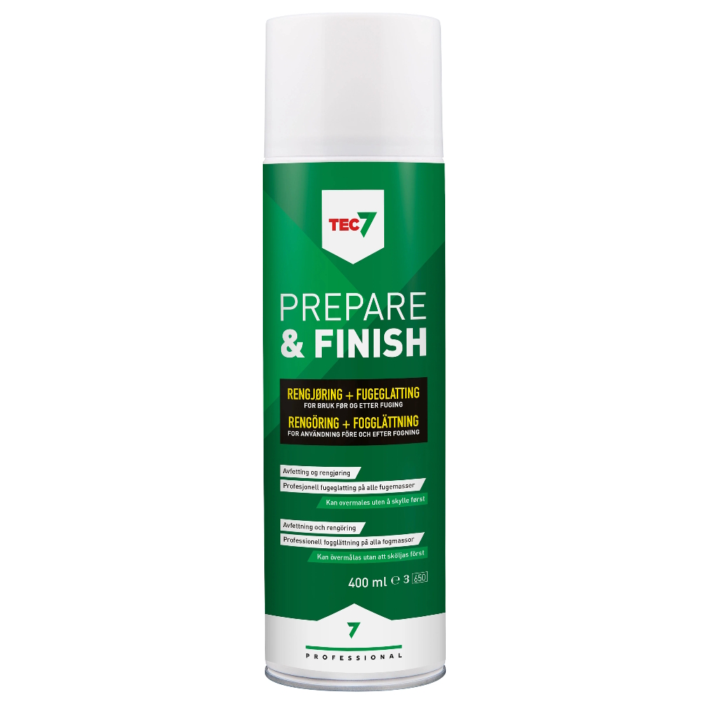 Limspray Prepare & Finish Tec7. Til brug før og efter fugning. Rengøring og affedtning af overfladen giver perfekt vedhæftning til underlaget. Udjævning og nivellering af påført fugemasse giver en glat og fin overflade og forsegler og lukker porer, der reducerer væksten af skimmelsvamp. Prepare & Finish er pH-neutral og derfor sikker at bruge på alle overflader og egnet til brug med alle typer fugemasse.