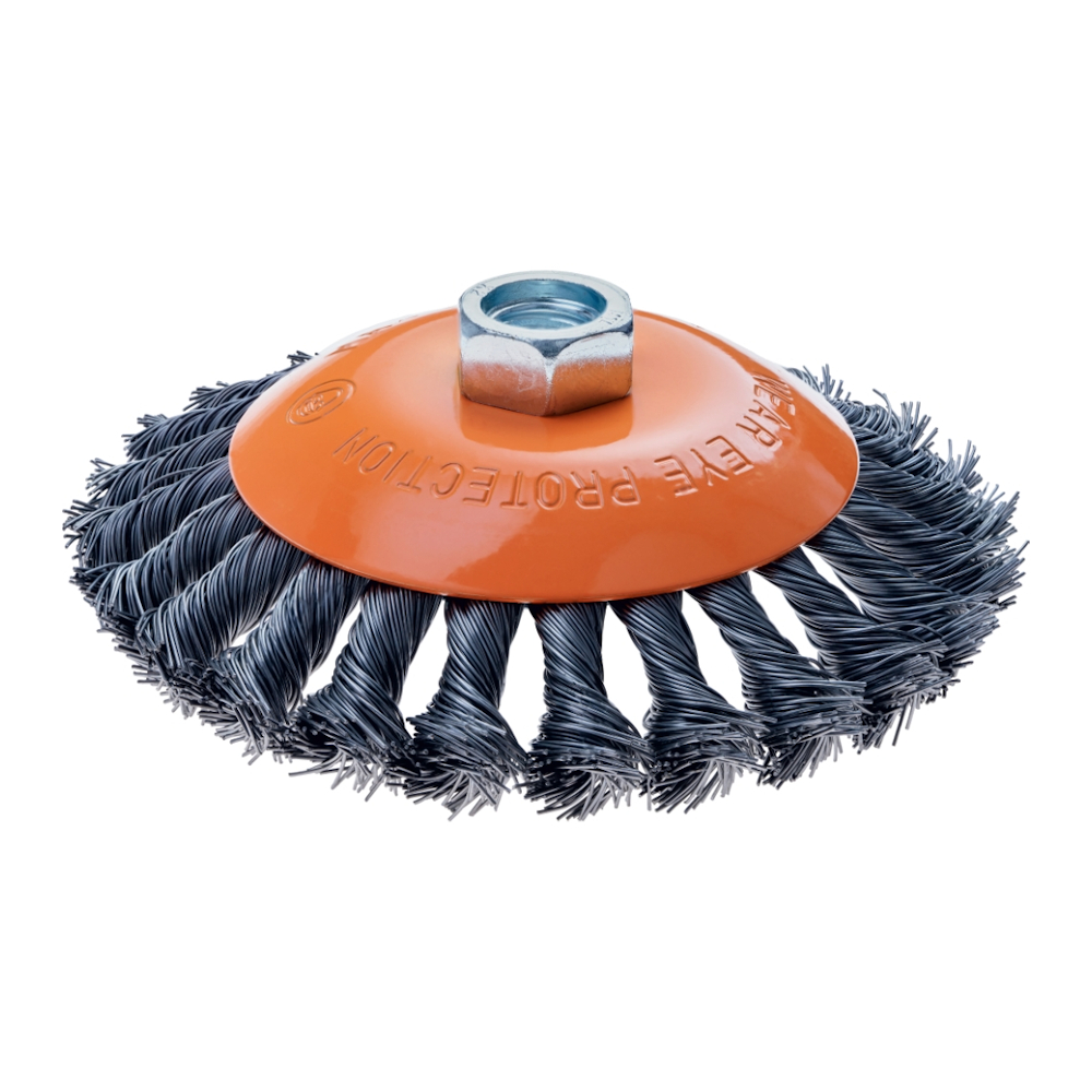 Rund stålbørste, M14-beslag til vinkelsliber. Bruges til rengøring, afgratning eller fjernelse af maling.