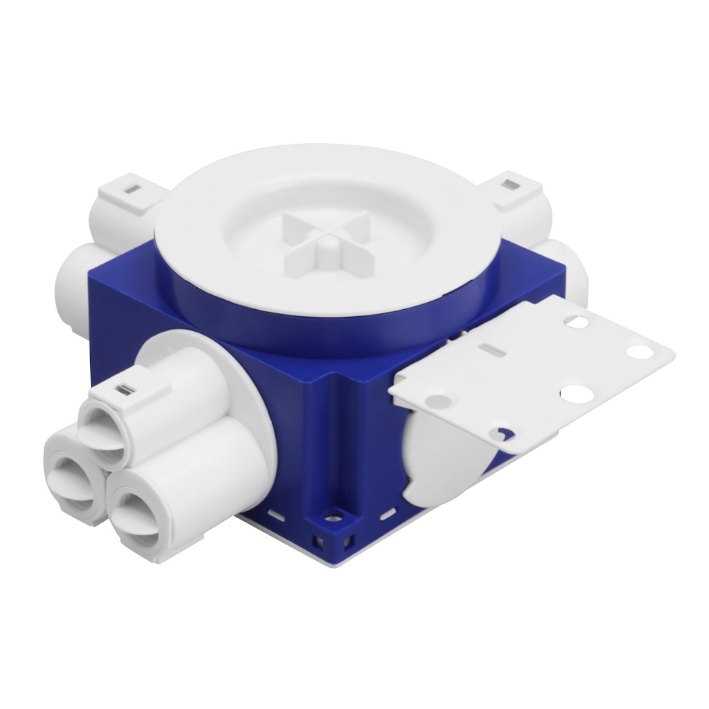 Komplementboks med forbindelser til 16 mm VP-/flexrør, passende størrelse hulsav er 73 mm eller 74 mm på enkeltboks.