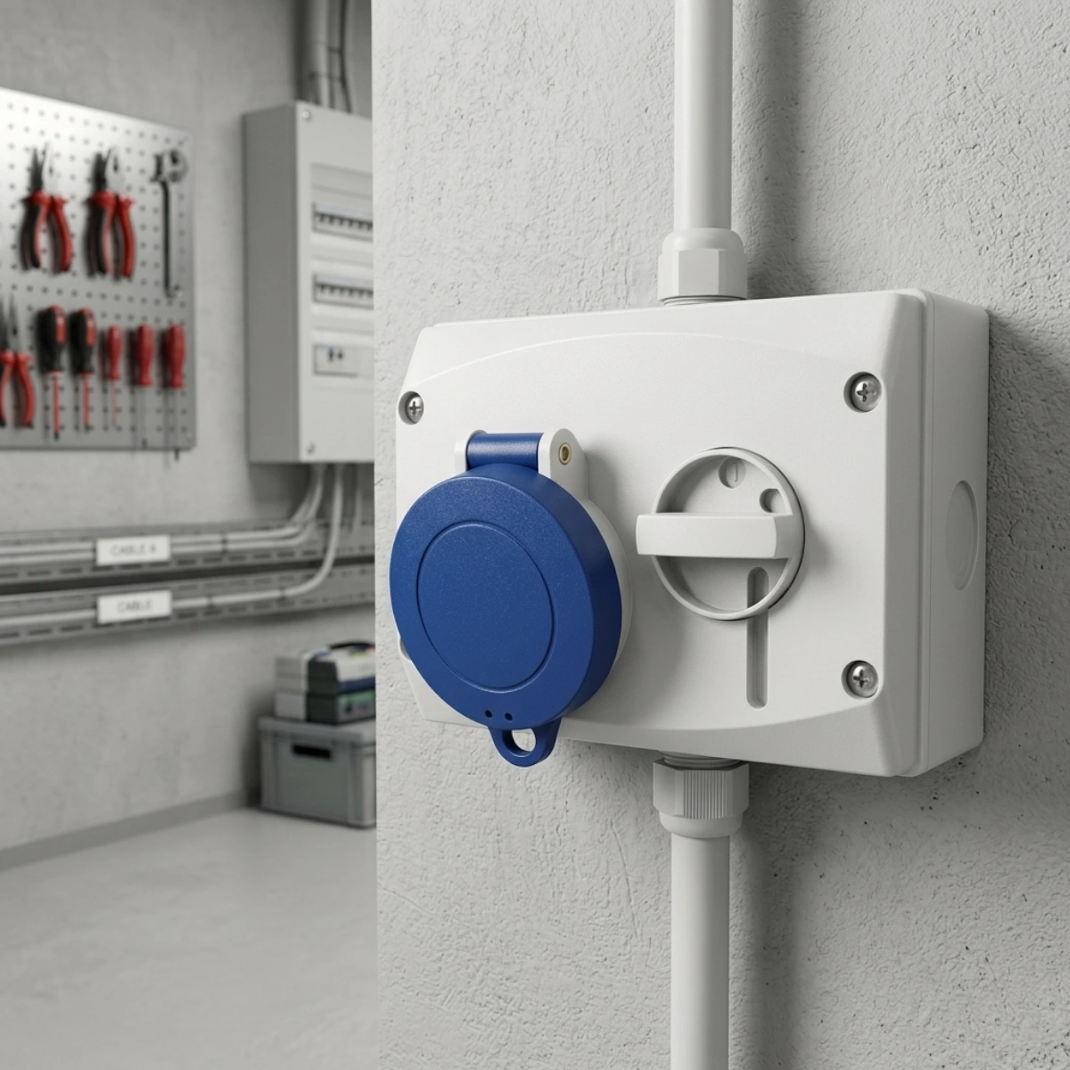 Læs mere her Sikkert 16A 230V CEE-vægstik til industrien, robust med mekanisk forrigling og låsbar afbryder for maksimal sikkerhed.