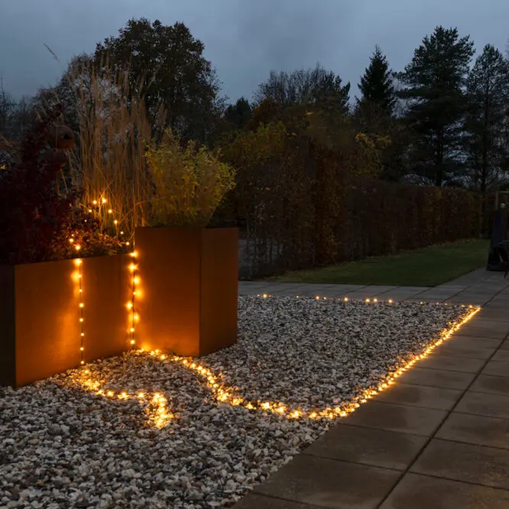 ShineLine er lyskæden, der tager din udendørsbelysning til det næste niveau. Takket være dens tætmonterede, indbyggede LED-lys filtrer den sig ikke sammen og sidder pænt langs kæden - perfekt til at følge konturer omkring vinduer eller oplyse gangstier i haven med en funklende, varm glød. ShineLines ravfarvede LED-lys skaber en elegant og magisk atmosfære, der forbedrer både hverdagen og festerne.