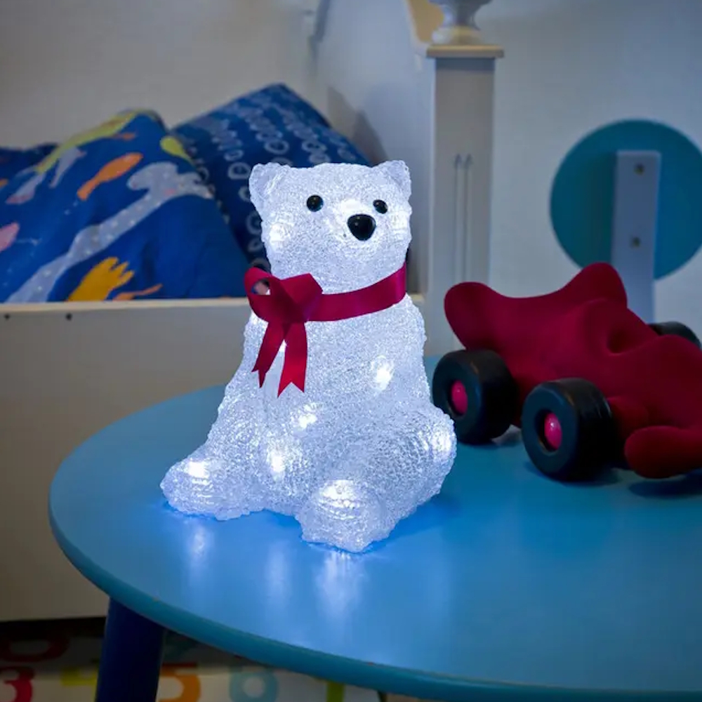 Charmerende isbjørn i slidstærk akrylplast, med 16 LED-lys, der spreder et smukt hvidt skær.