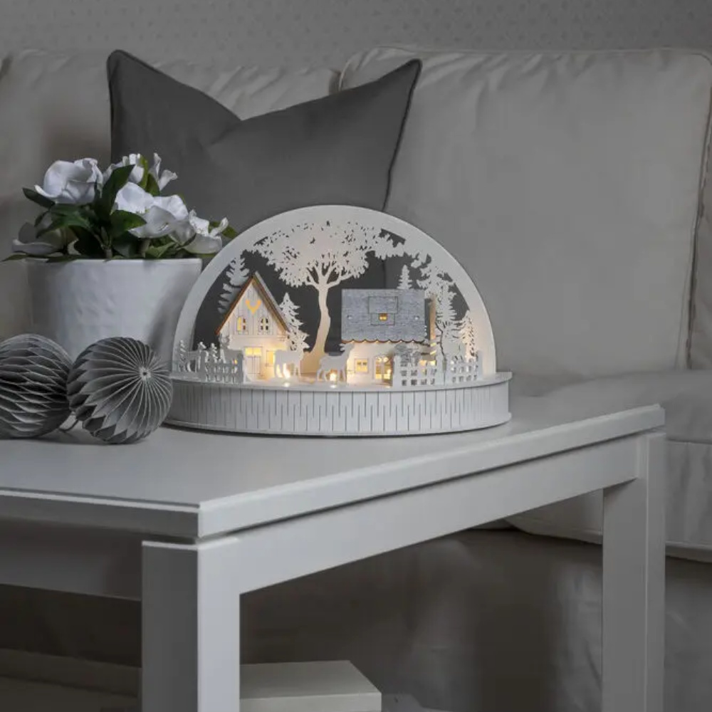 Charmerende juledekoration med snemand, dyr og små huse. Lavet af træ med hvide detaljerede silhuetfigurer og 5 varme hvide LED'er. Udstyret med en 6-timers timer og batteridrift, så du nemt kan placere den, hvor den spreder mest julestemning.